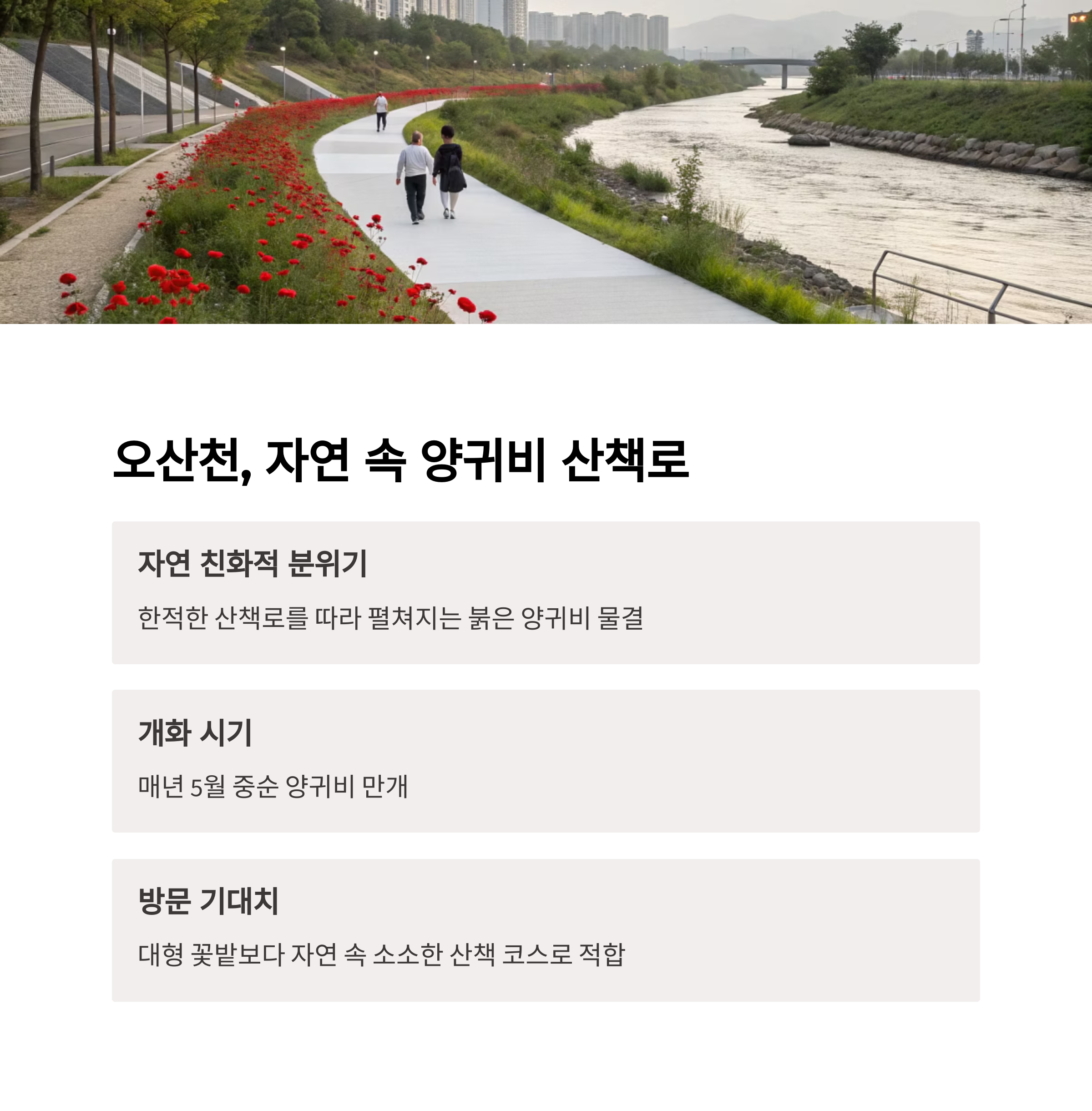 | 오산천 | 오산천 둔치·산책로 | 인근 주차장 이용 | 무료 | 5월 중~6월 | 자연친화 산책로, 소규모 꽃밭 |