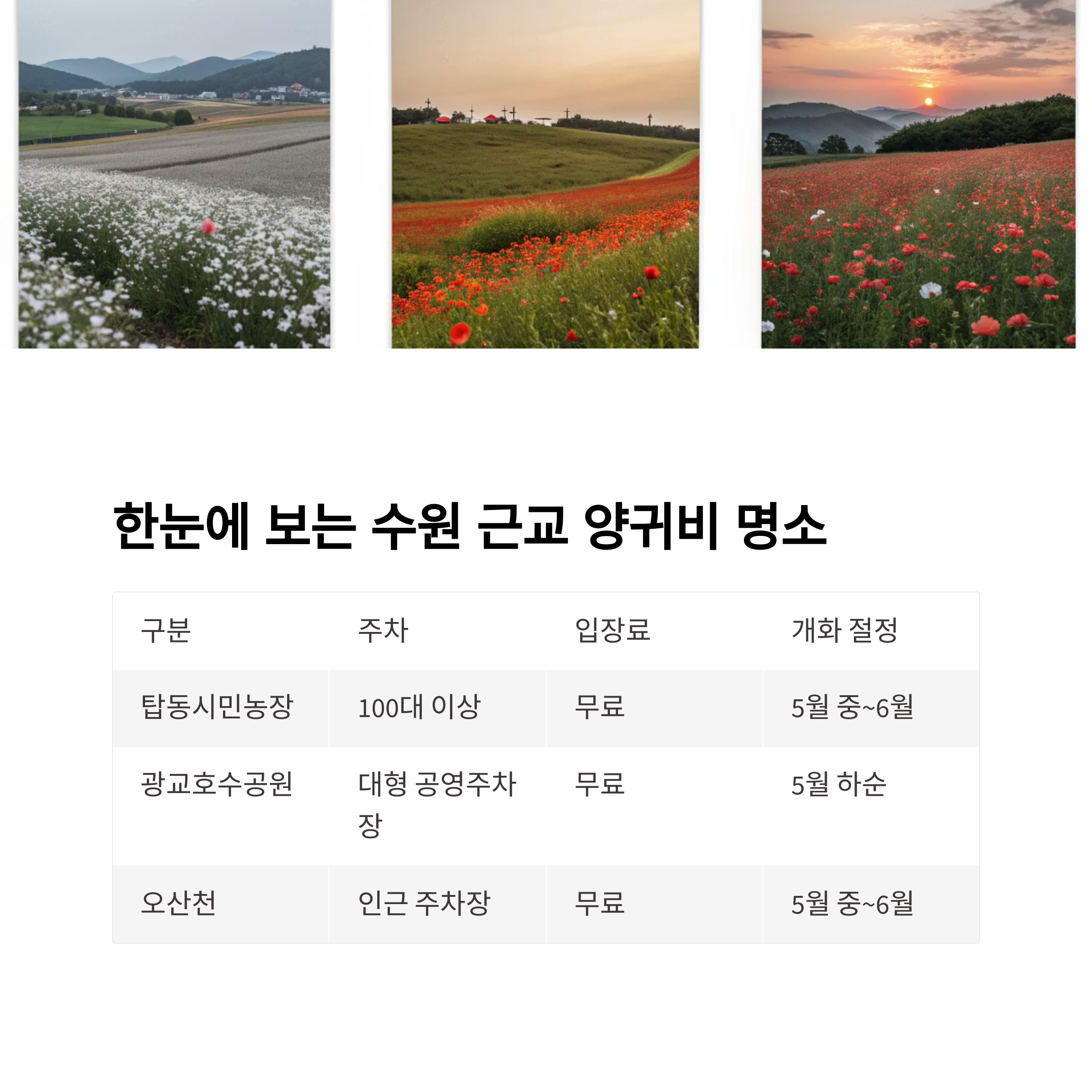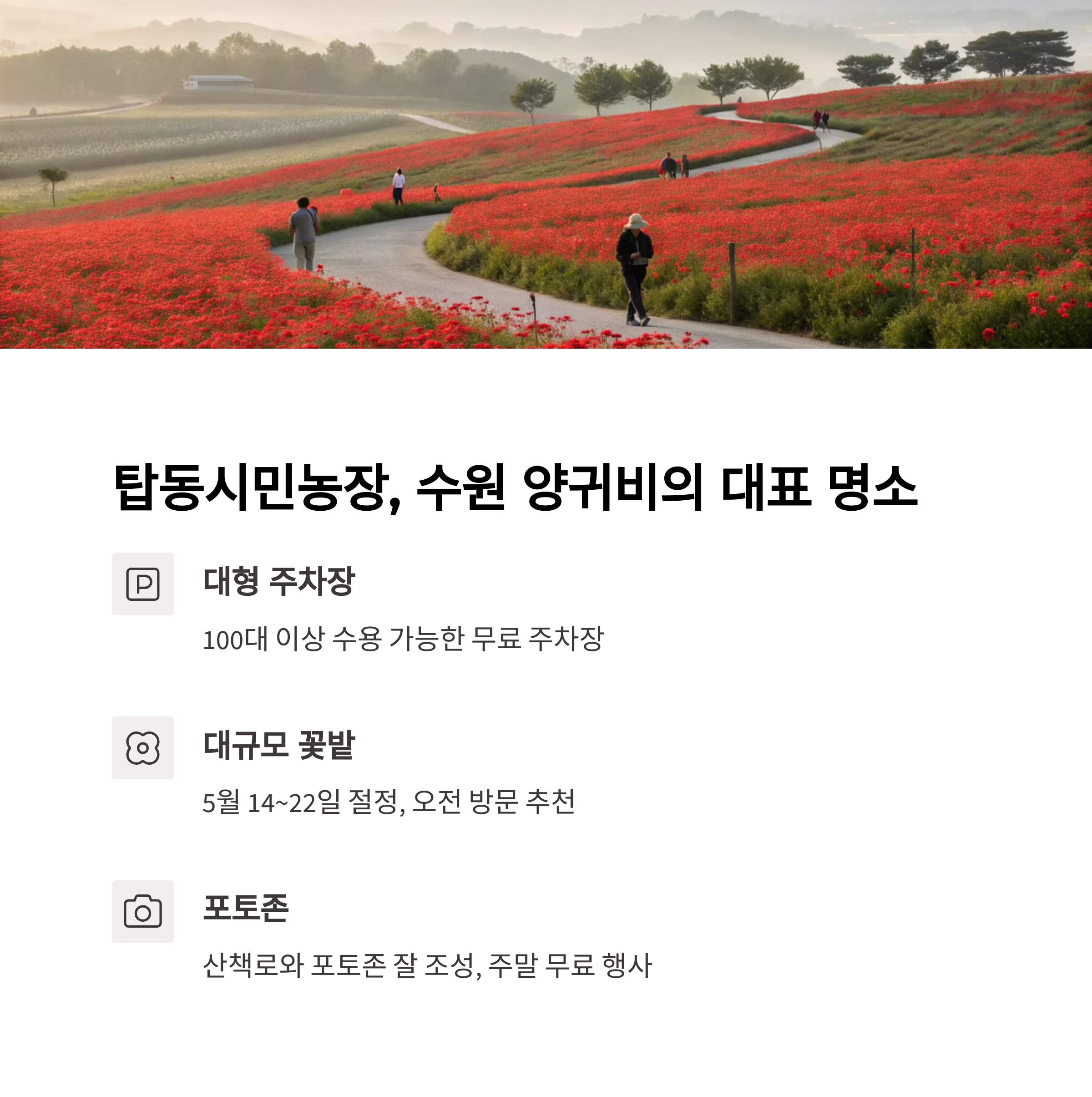 | 탑동시민농장 | 수원 권선구 서둔로 155 | 15대/100대 이상 | 무료 | 5월 중~6월 | 대규모 꽃밭, 문화행사 |