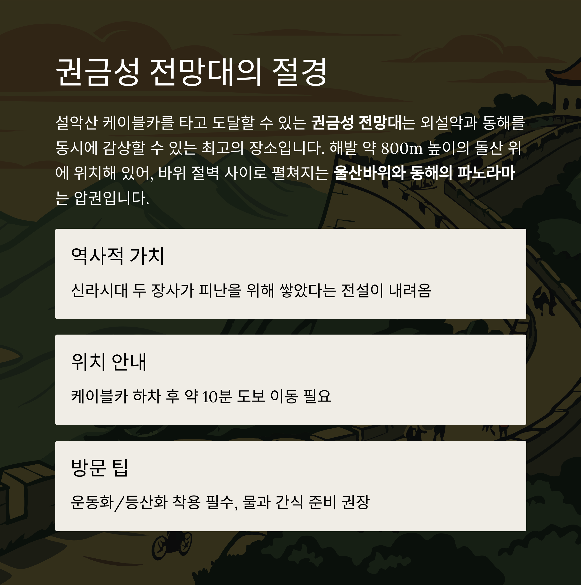 | 권금성 전망대 | 설악산 입장료 별도 | 케이블카 시간과 동일 | 도보 이동 필요 |