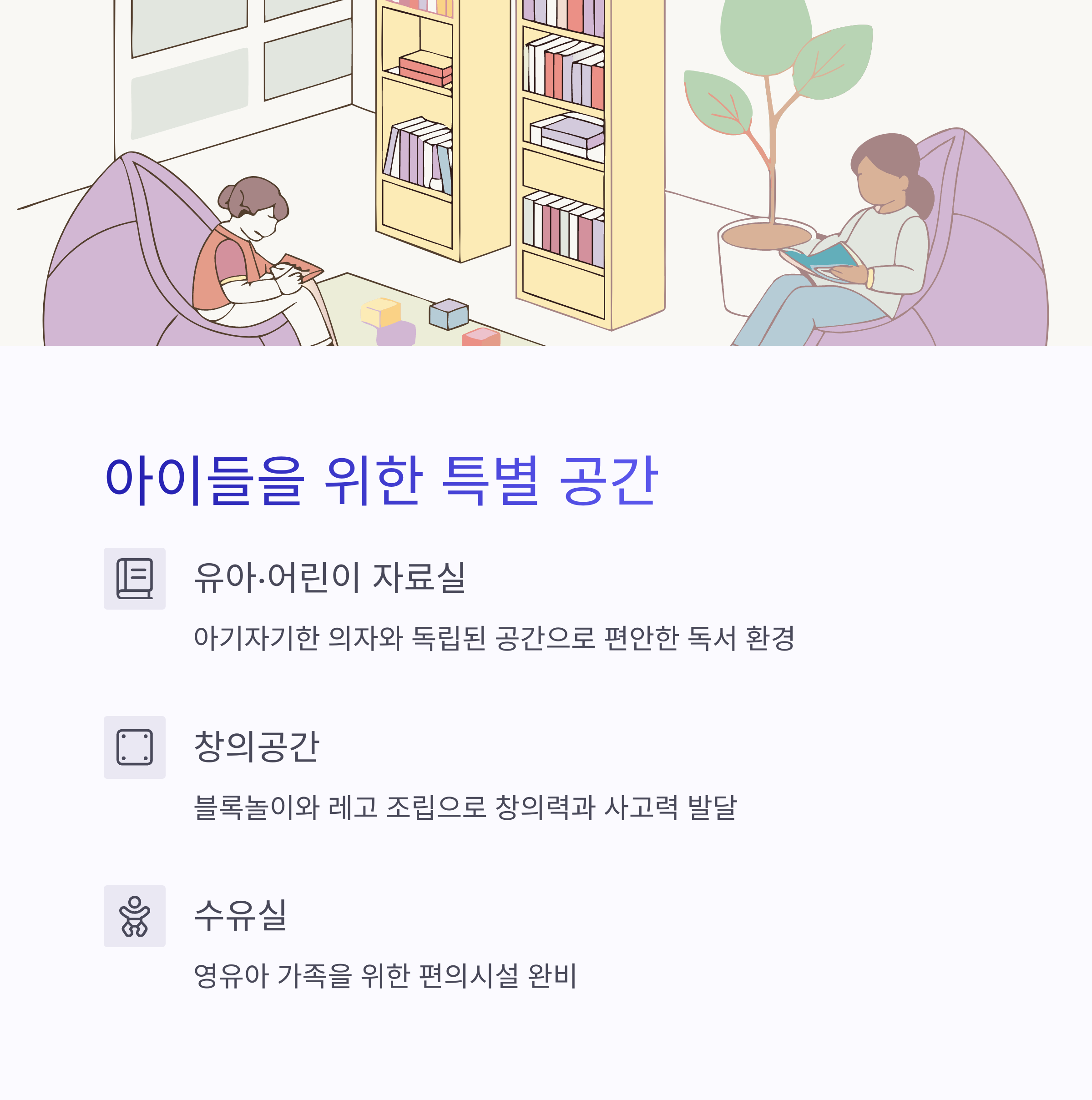 아기자기한 의자와 독립된 공간이 마련되어 있어 아이들이 편하게 책을 읽을 수 있습니다.