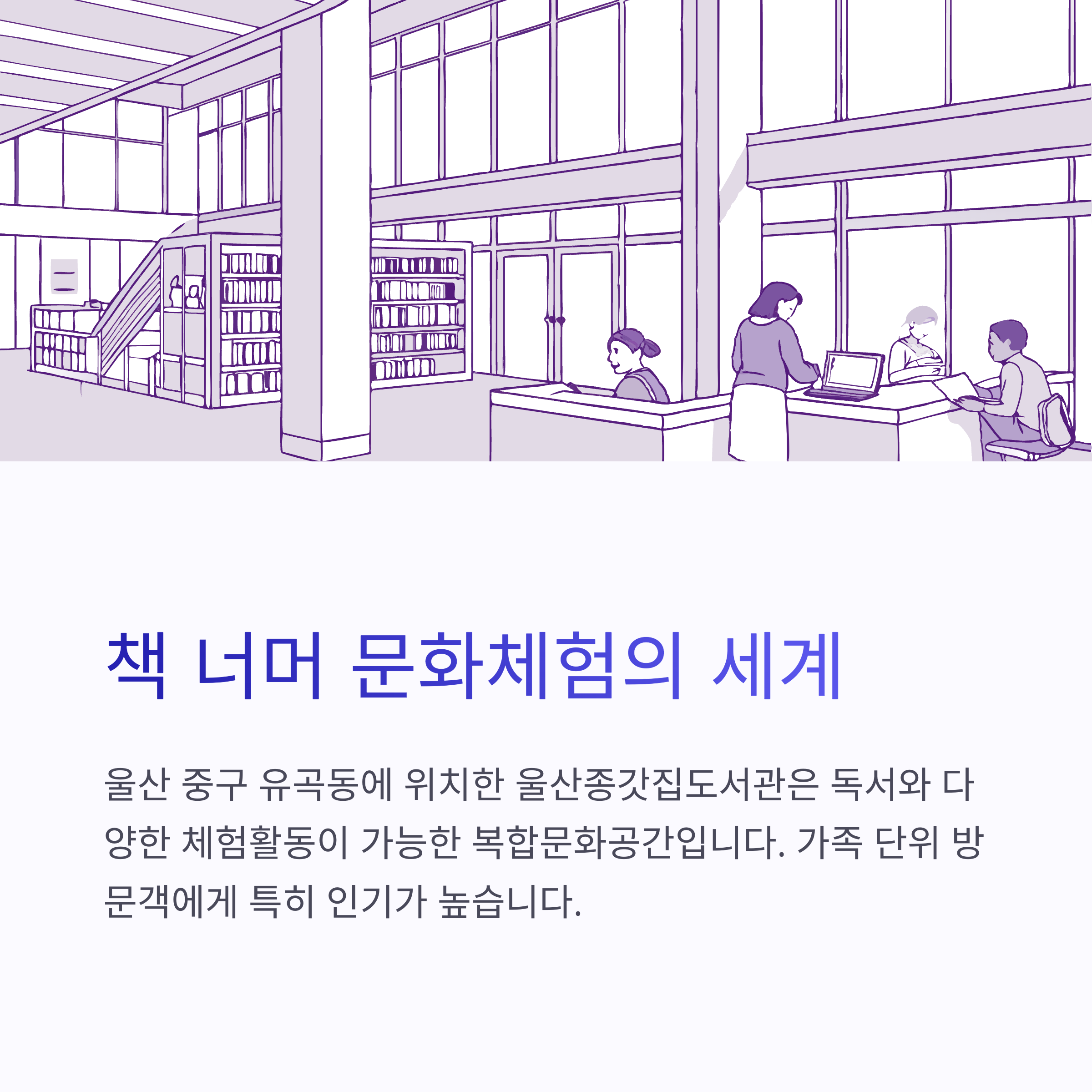 울산 중구 유곡동에 자리한 울산종갓집도서관은 책을 넘어 문화체험까지 가능한 복합문화공간입니다.