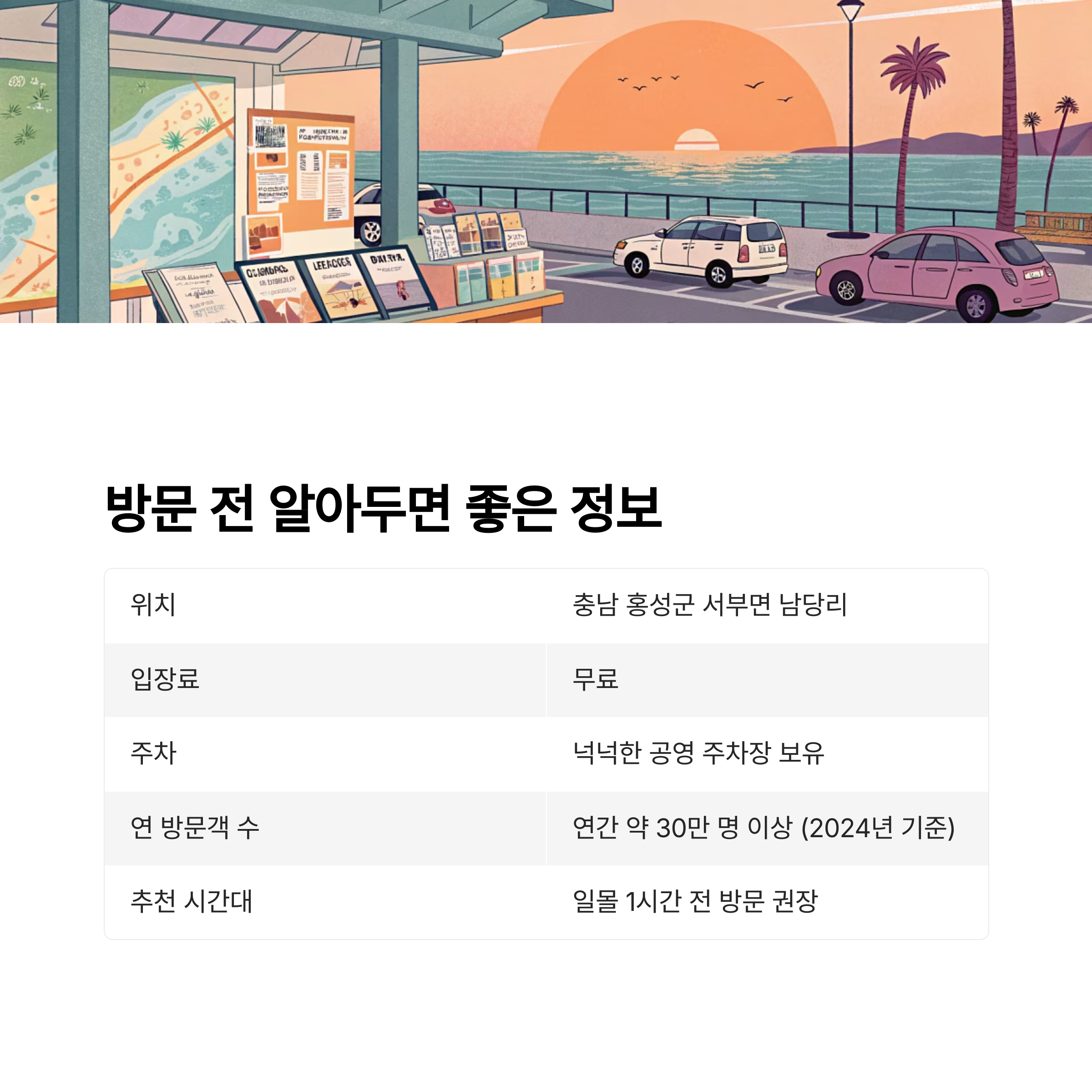특히 남당항 노을전망대는 연중 무료로 개방되며, 해상 데크를 통해 바다 위를 걷는 듯한 경험을 선사합니다.