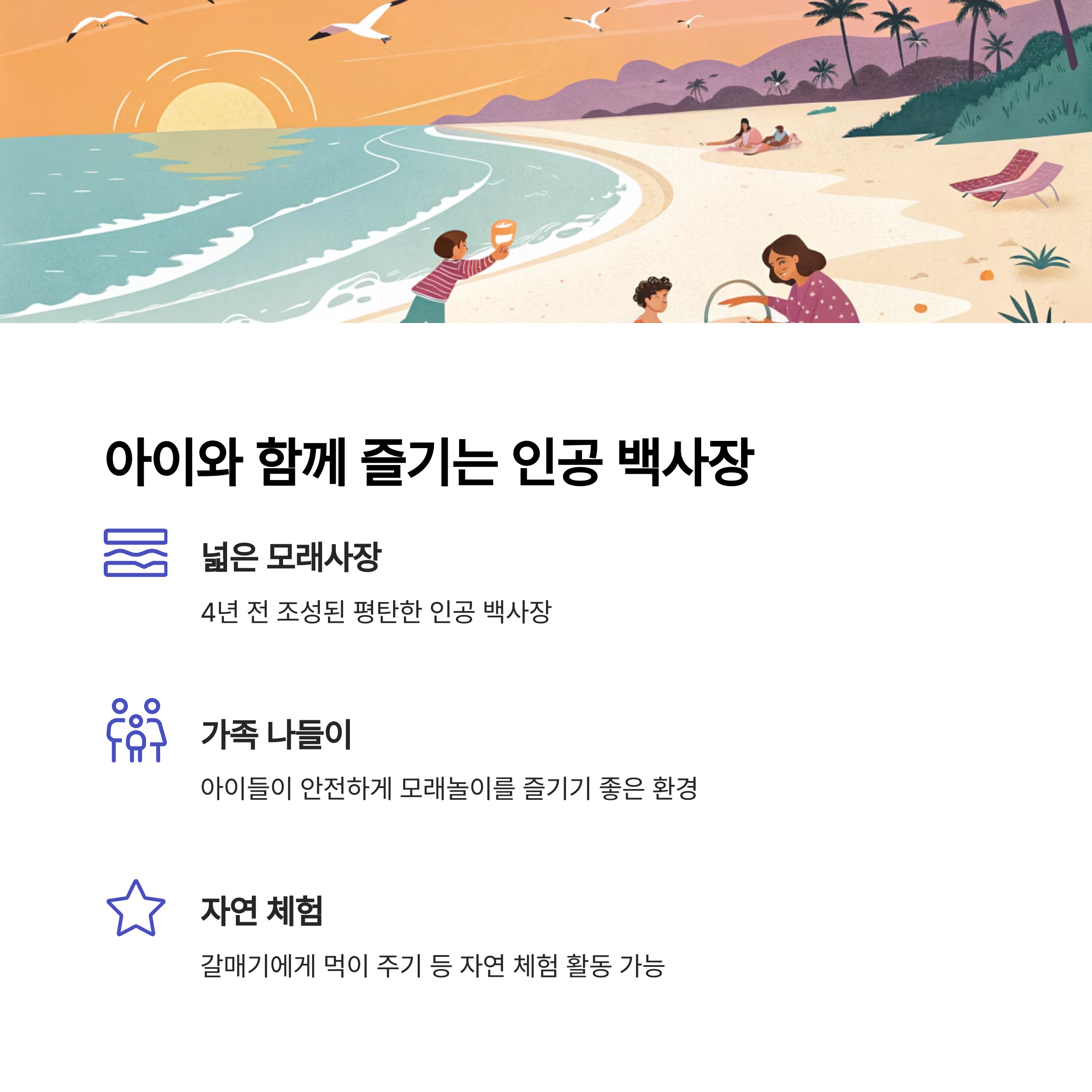 도시에서 쉽게 보기 어려운 바다와 모래가 함께 있는 조합 덕분에 가족 단위 나들이 장소로도 인기가 높습니다.