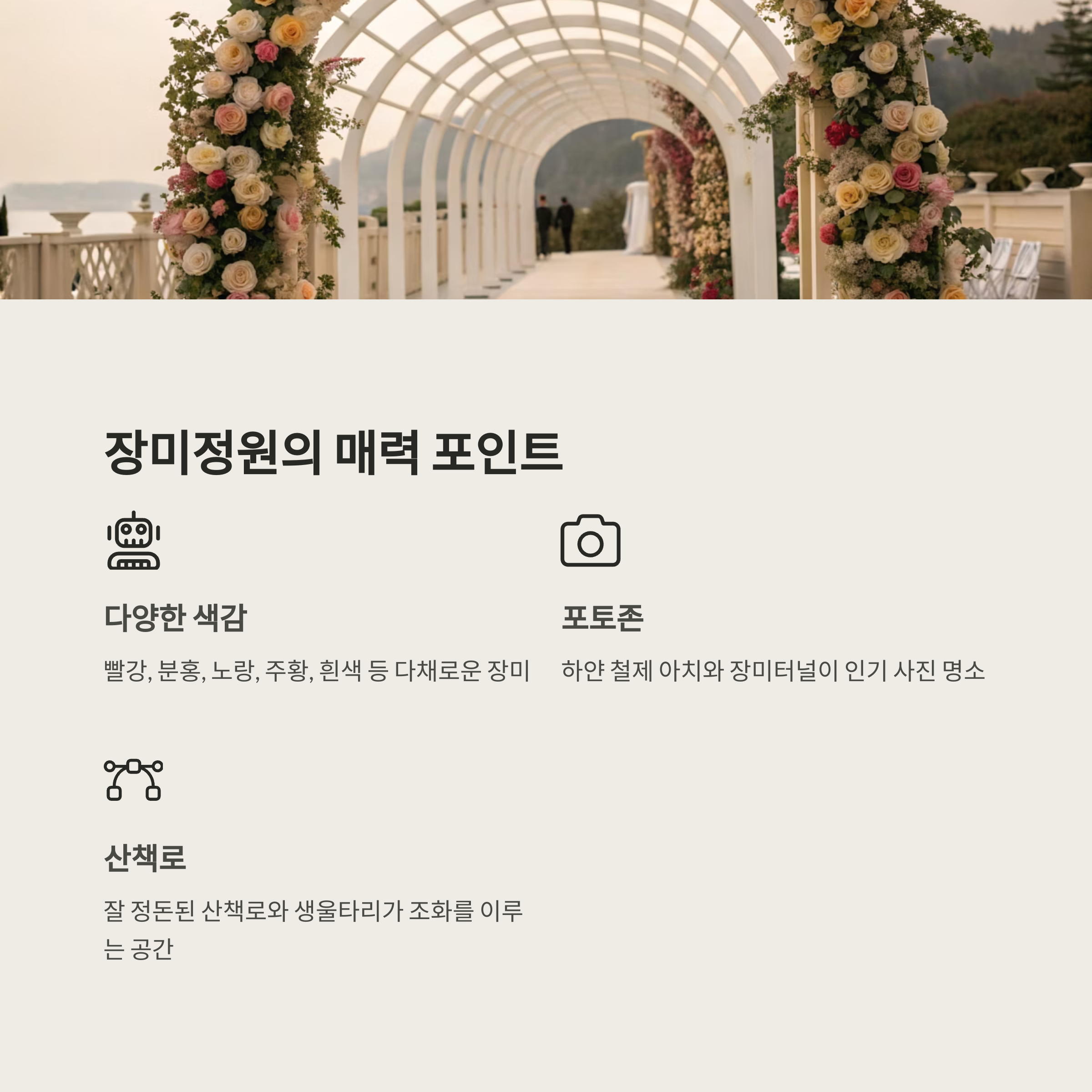 장미터널과 아치길은 사진 명소로 인기가 높습니다.