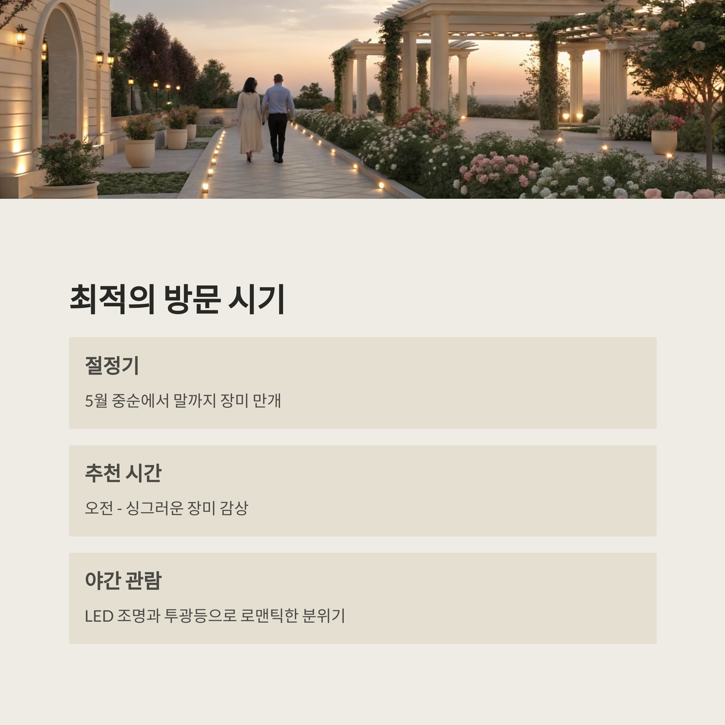 방문하시면 더욱 싱그럽고 활짝 핀 장미를 감상하실 수 있습니다. 밤에는 LED 조명과