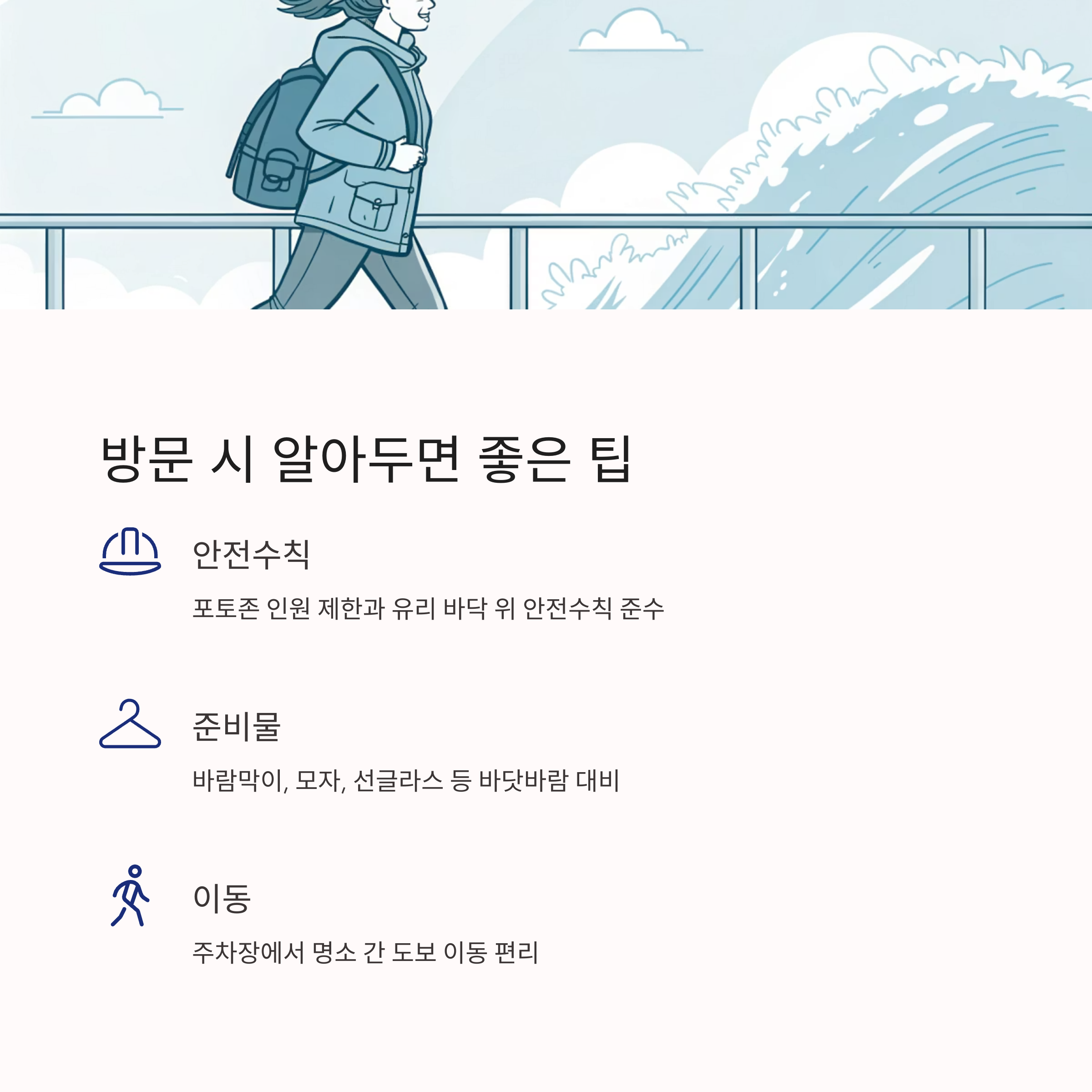 바닷바람이 강하니 얇은 겉옷이나 바람막이를 준비하시고, 여름철에는 모자와