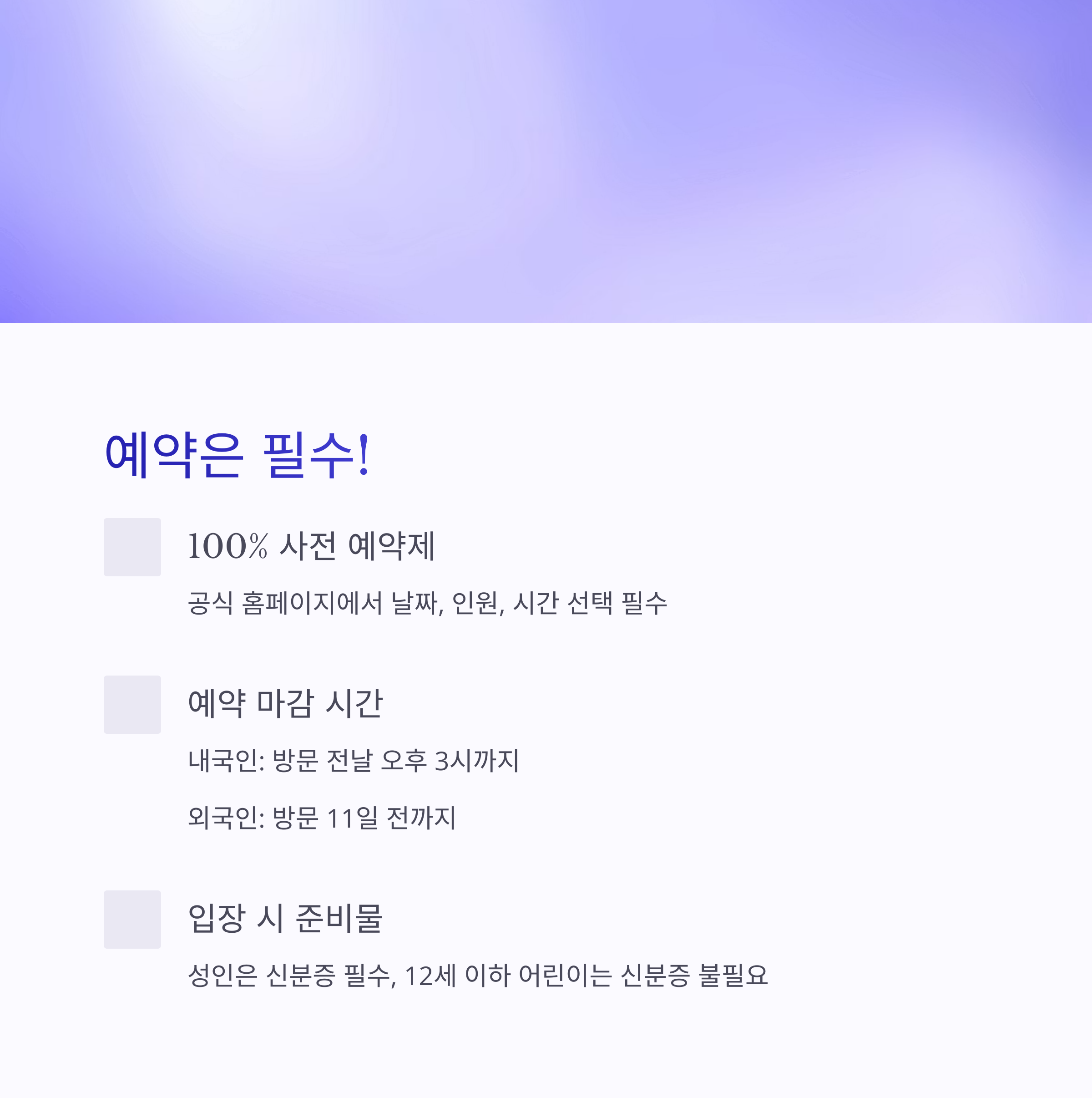 - 내국인 예약 마감: 방문 전날 오후 3시까지