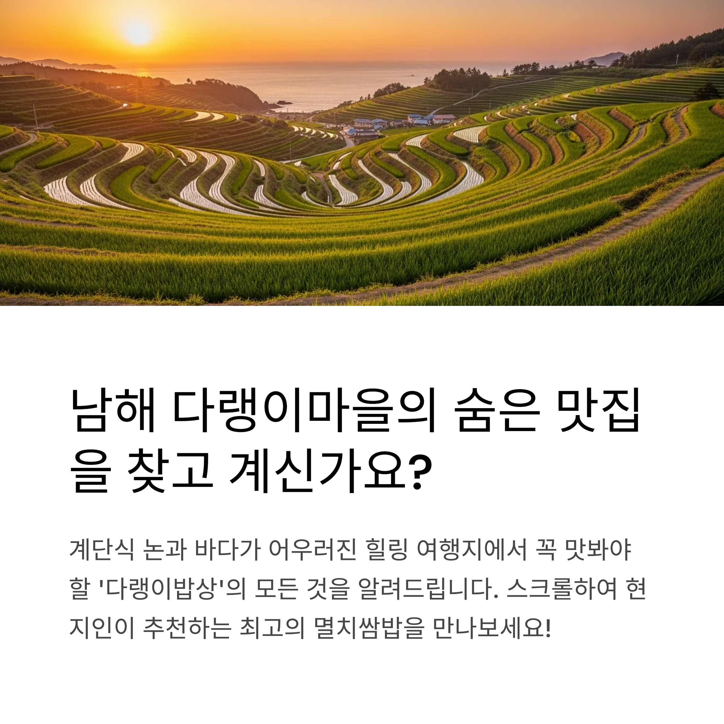 남해 다랭이마을은 계단식 논과 탁 트인 바다 풍경이 어우러진 한국의 대표적인 힐링 여행지입니다. 산과 바다가 동시에 어우러진 독특한 지형은 많은 여행객의 발길을 끌어당기며, 이곳을 찾는 이들이 놓치지 않는 것이 바로 ‘현지에서만 맛볼 수 있는 음식’입니다. 특히 지역 주민과 여행객 모두의 입소문을 타고 전국적인 인지도를 쌓은 맛집이 바로 ‘다랭이밥상’입니다. 다랭이마을의 상단에 위치한 이 식당은 남해 바다의 싱싱한 해산물, 그리고 향토 음식의 정수를 그대로 담아낸 멸치쌈밥으로 유명합니다. 관광명소와 맛집이 공존하는 이 지역에서 과연 왜 이곳이 ‘단연 최고의 식당’으로 불리는지, 실제 방문자들의 평가와 함께 전격 분석해보겠습니다.