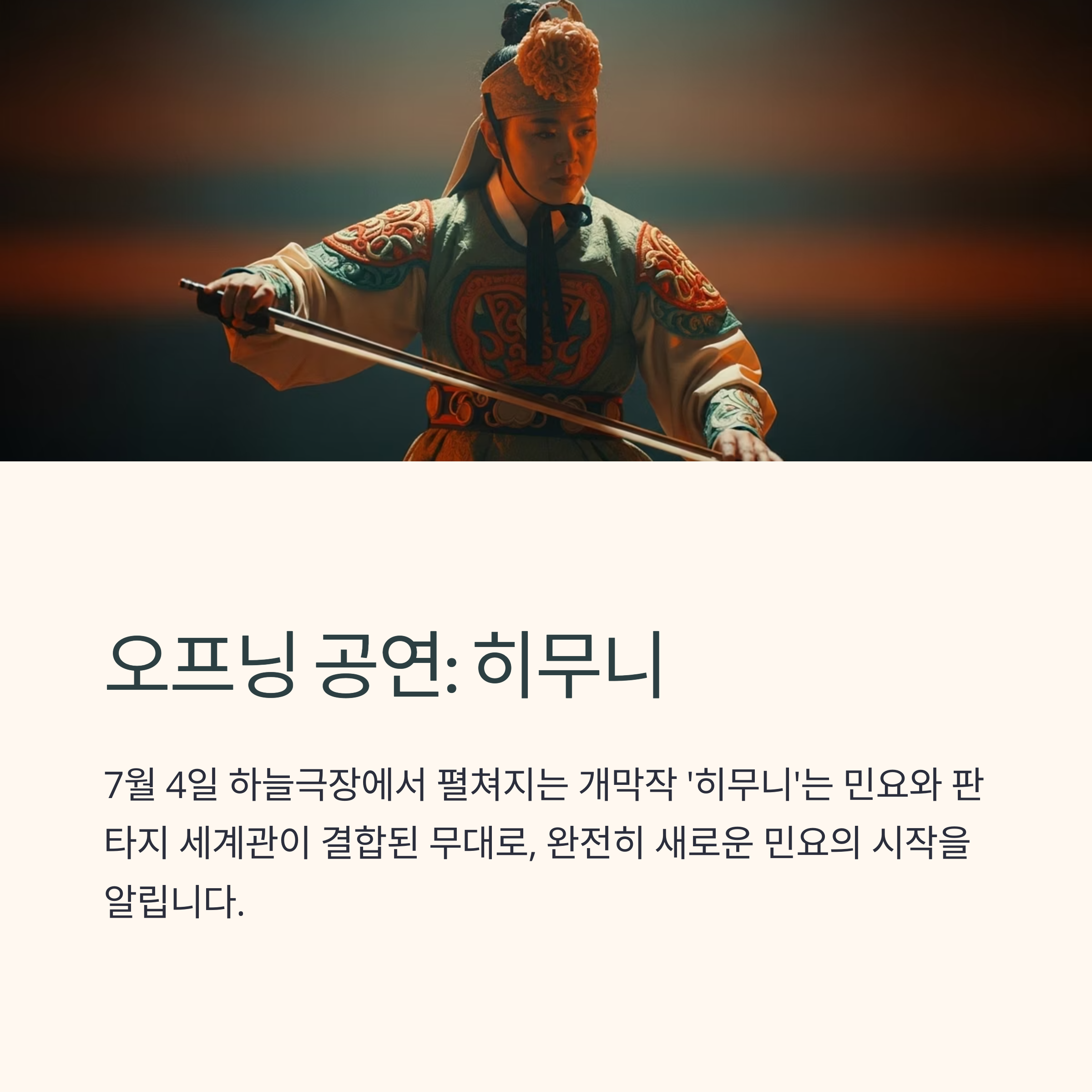 공식 개막작 ‘히무니’는 민요와 판타지 세계관이 결합된 무대로, 관객에게 완전히 새로운 민요의 시작을 알립니다.
