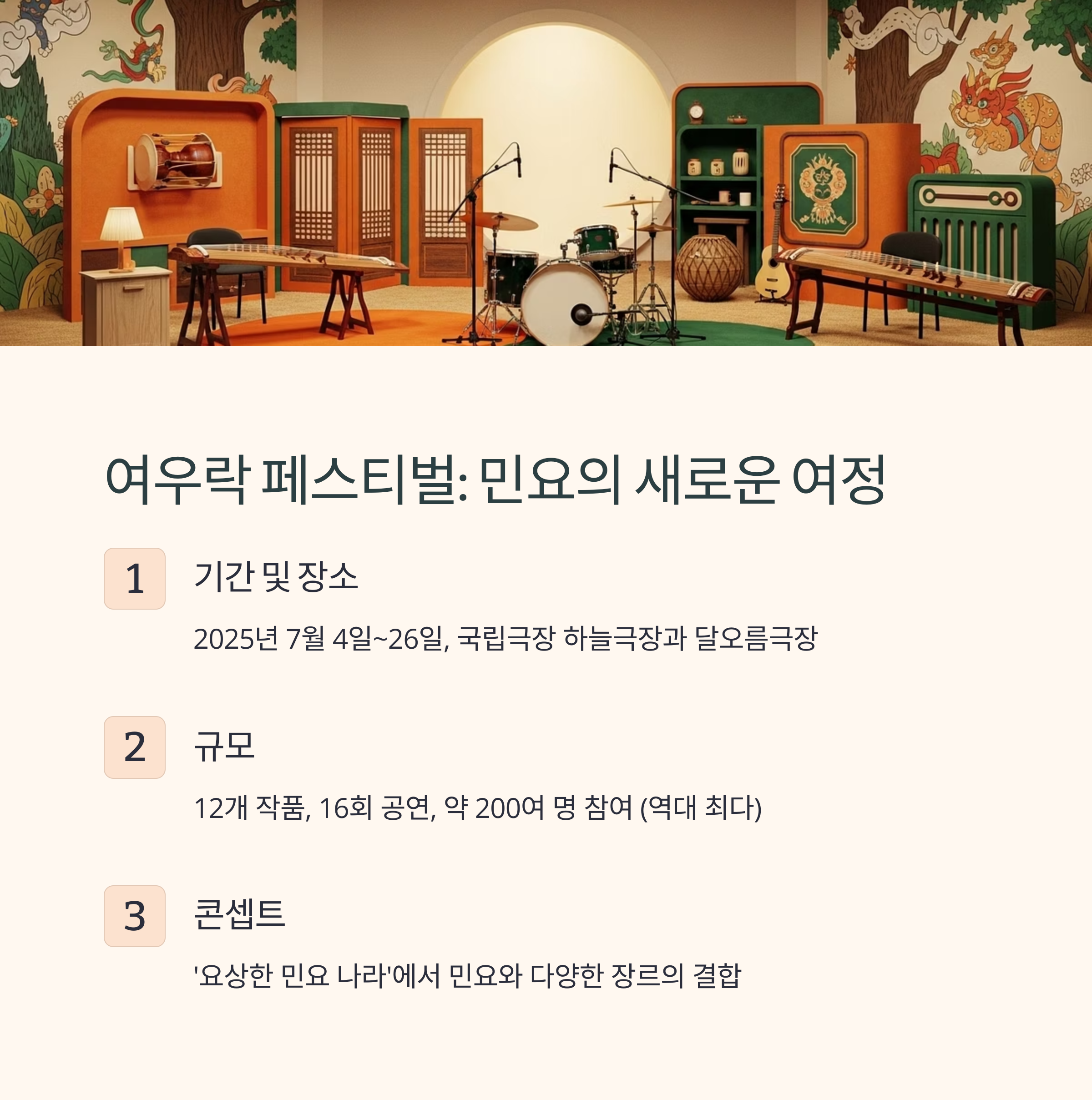2025년 여름, 서울 국립극장에서는 단순한 전통공연을 넘어서는 음악 축제가 펼쳐집니다. 이름만 들어도 생경한 ‘여우락(與樂)’ 페스티벌은 올해로 16번째 시즌을 맞이하며, 오랜 역사와 깊이를 자랑하는 ‘민요’를 전면에 내세운 새로운 음악 실험의 장이 될 예정입니다. 단지 음악을 듣는 것이 아니라 ‘요상한 민요 나라’라는 콘셉트를 따라 하나의 세계를 탐험하는 기분을 느낄 수 있게 구성되었기 때문에, 음악 애호가는 물론 색다른 문화 체험을 원하는 사람들에게도 큰 관심을 받고 있습니다. 올해는 200여 명의 아티스트가 참여하고, 공연장에서는 다양한 부대행사와 체험까지 함께 진행됩니다. 특히 패키지 티켓을 통한 할인 예매 혜택도 주어지기 때문에, 지금이 바로 예매를 서두를 시점입니다.