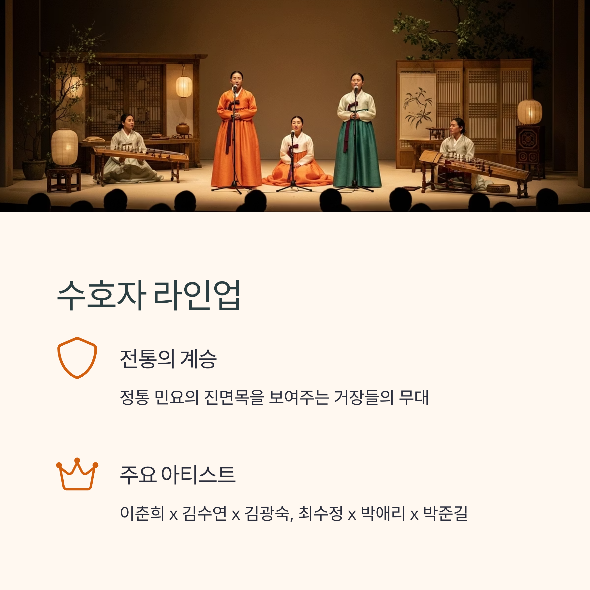 전통을 지키는 거장들의 무대로, 정통 민요의 진면목을 보여줍니다.