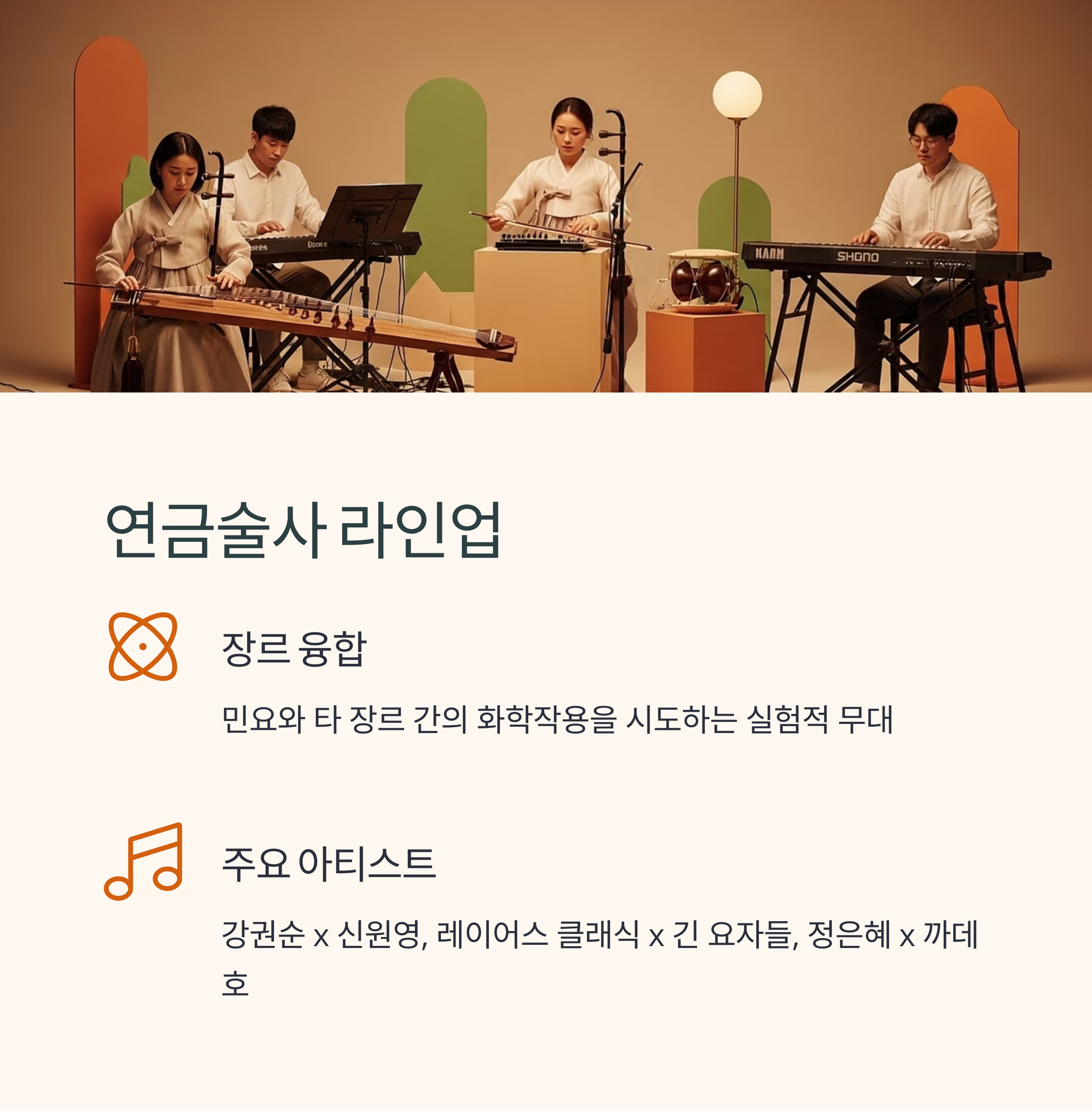 민요와 타 장르 간의 화학작용을 시도하는 팀들로 구성되어 있습니다.