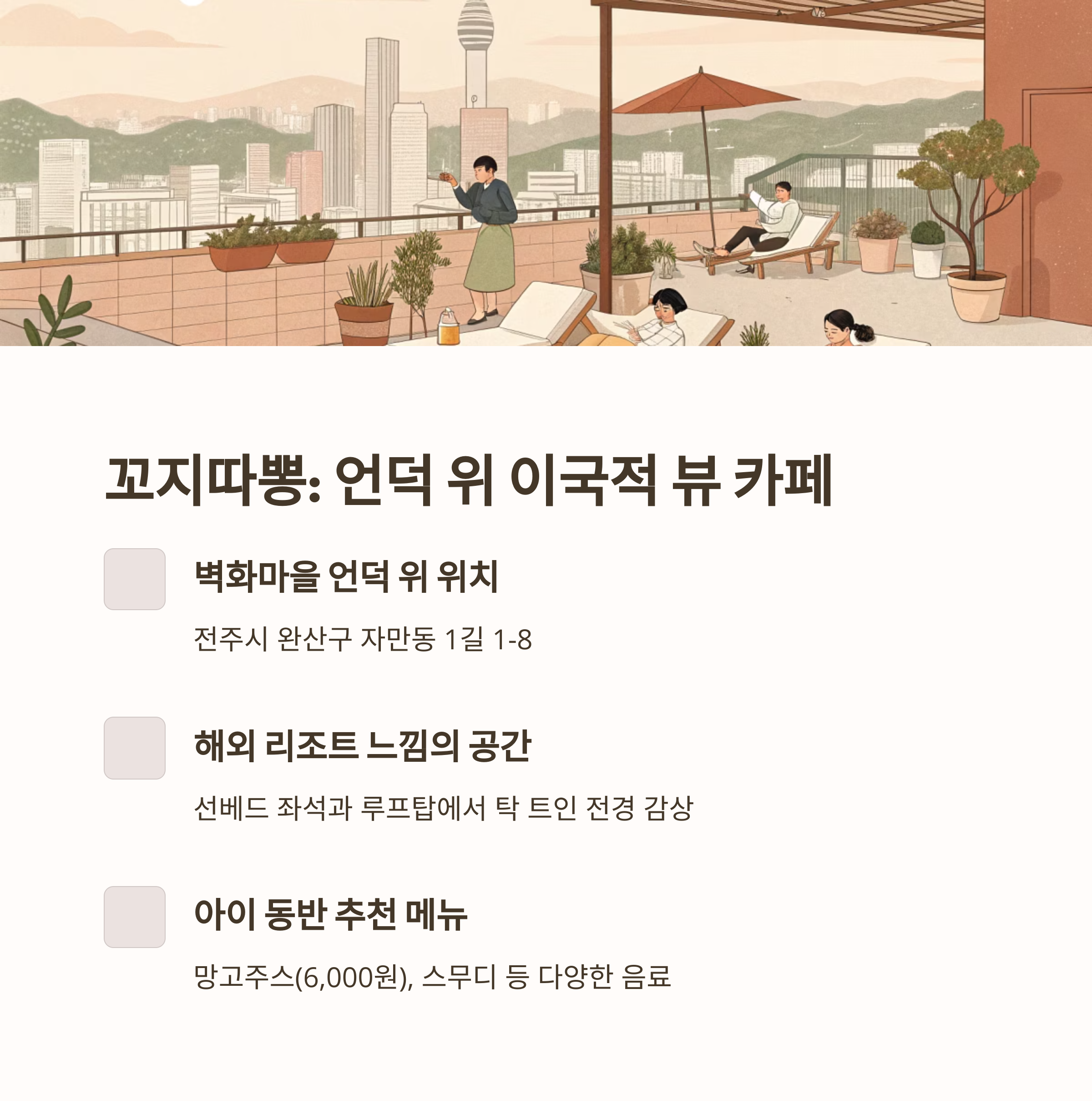 자만벽화마을 골목을 지나 언덕을 따라 올라가면 마주할 수 있는 꼬지따뽕은, 전주의 숨겨진 보석 같은 뷰 카페입니다. 특히 아이와 함께라면 시원한 과일주스 한 잔과 탁 트인 전경을 감상하며 잠시 쉴 수 있는 장소로 제격입니다.