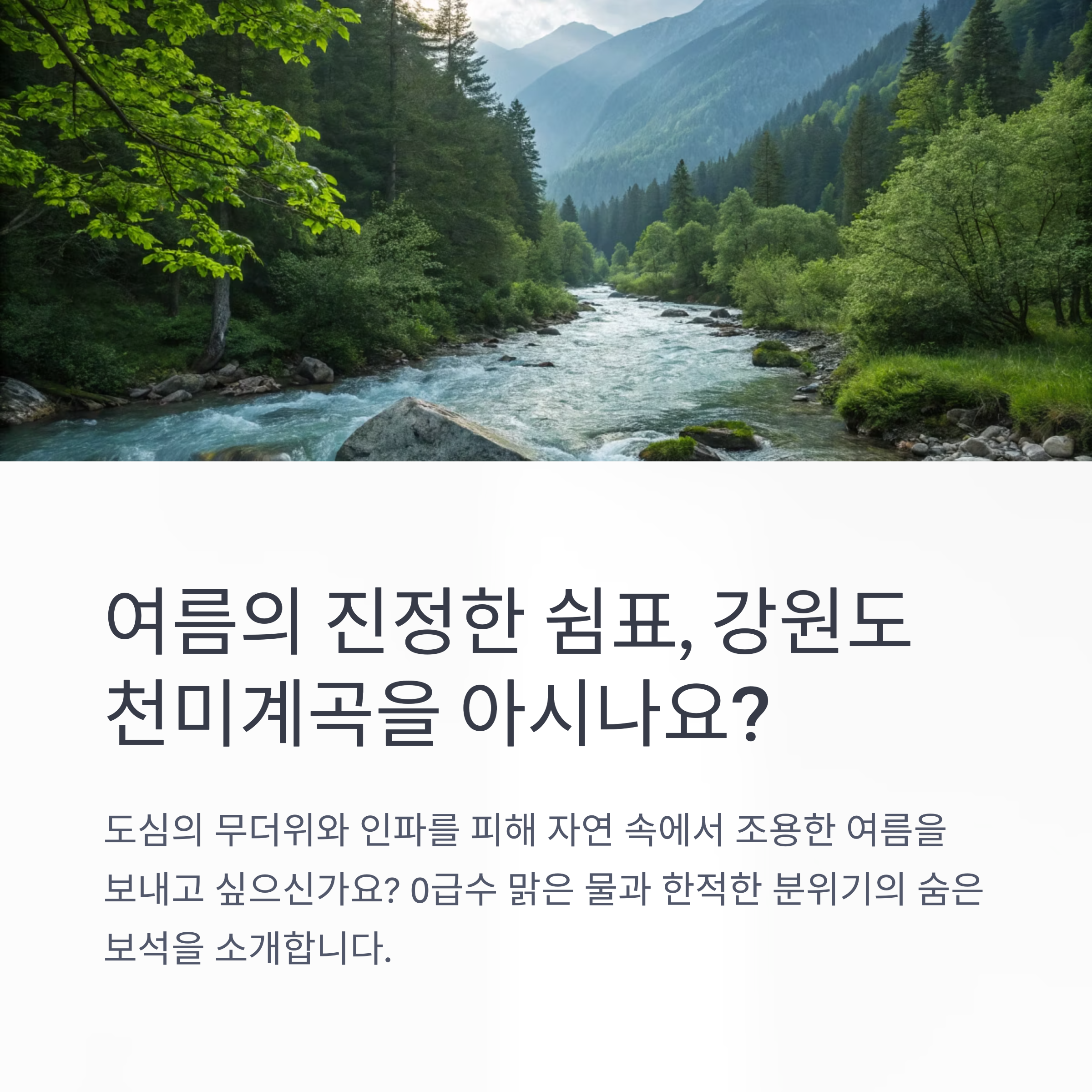 천미계곡은 맑은 물, 조용한 분위기, 생태적 가치, 캠핑과 트레킹까지 모두 갖춘 강원도의 숨은 명소다. 관광지처럼 붐비는 장소보다는 자연 그대로의 계곡에서 진정한 여름을 느끼고 싶은 사람이라면, 이곳이야말로 최고의 선택이 될 것이다. 자연과 가까워질 준비가 되었다면, 이번 여름에는 천미계곡으로 떠나보자.