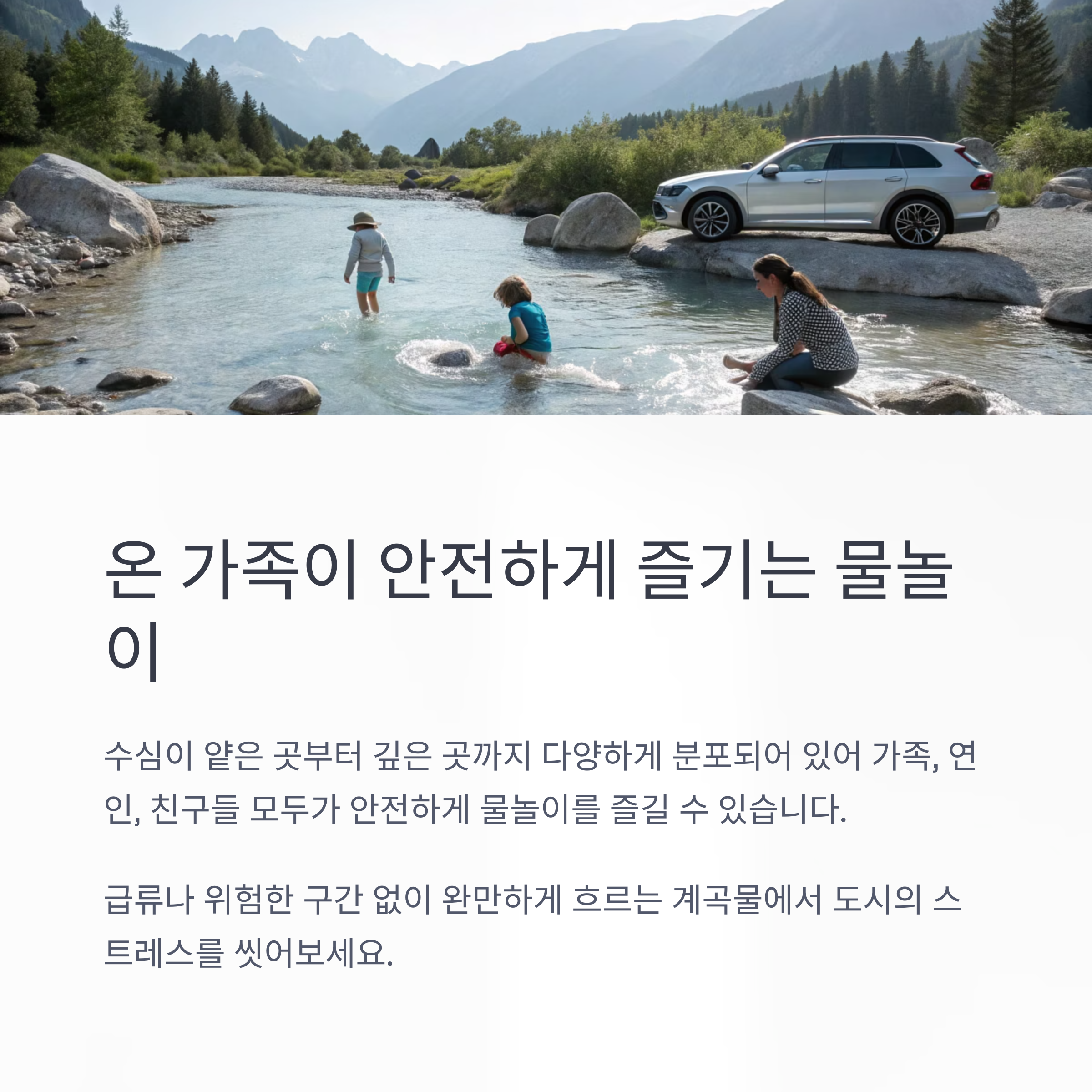 | 수심 | 얕은 곳~깊은 곳 다양, 안전하게 물놀이 가능 |