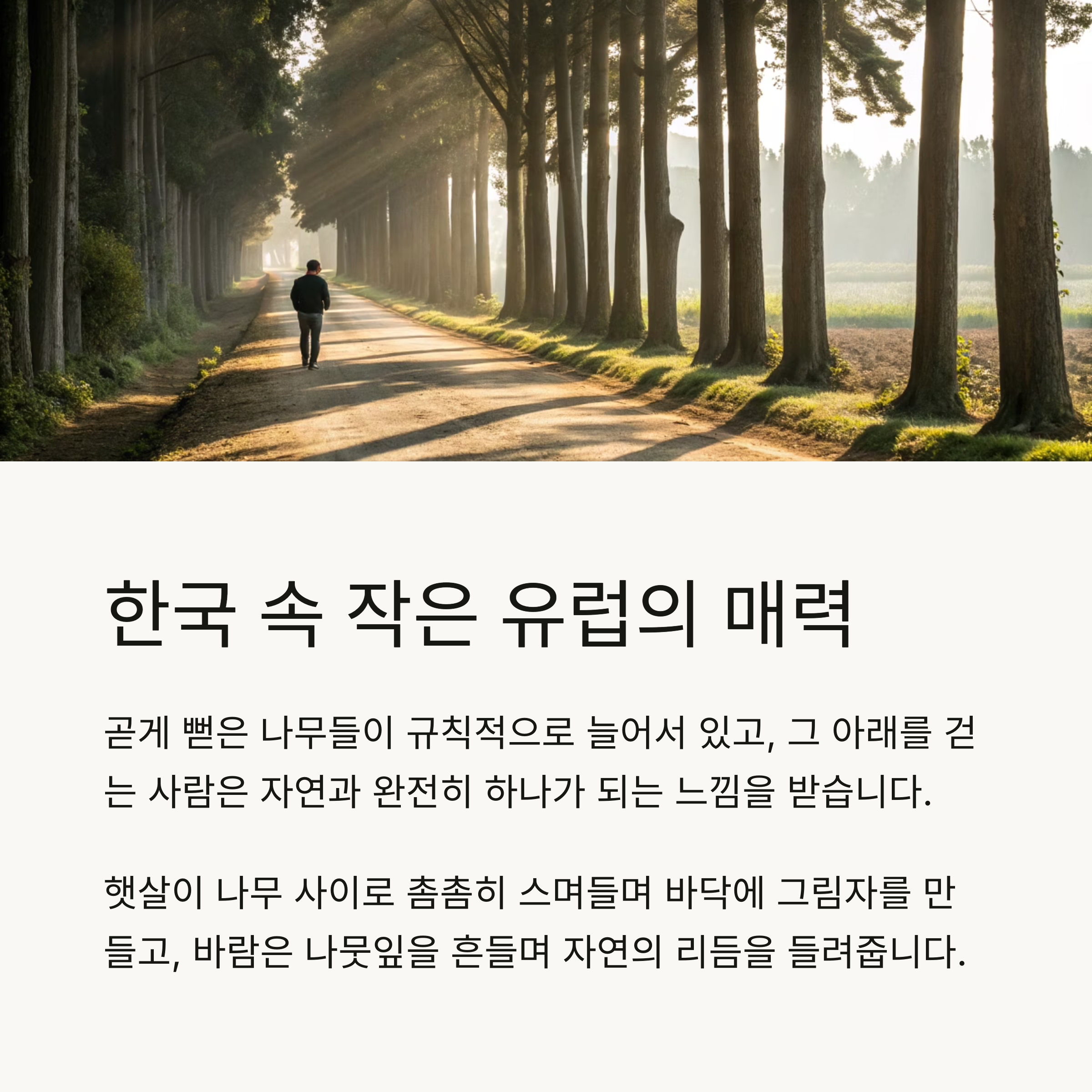 이 길이 유럽풍으로 불리는 이유는 단순히 ‘이국적이다’라는 이미지 때문이 아니다. 곧게 뻗은 나무들이 규칙적으로 늘어서 있고, 그 아래를 걷는 사람은 자연과 완전히 하나가 되는 느낌을 받기 때문이다. 특히 프랑스의 작은 시골길이나 독일의 삼림지대를 연상케 하는 길의 분위기는, 한국 속 작은 유럽이라 불리기에 충분하다.