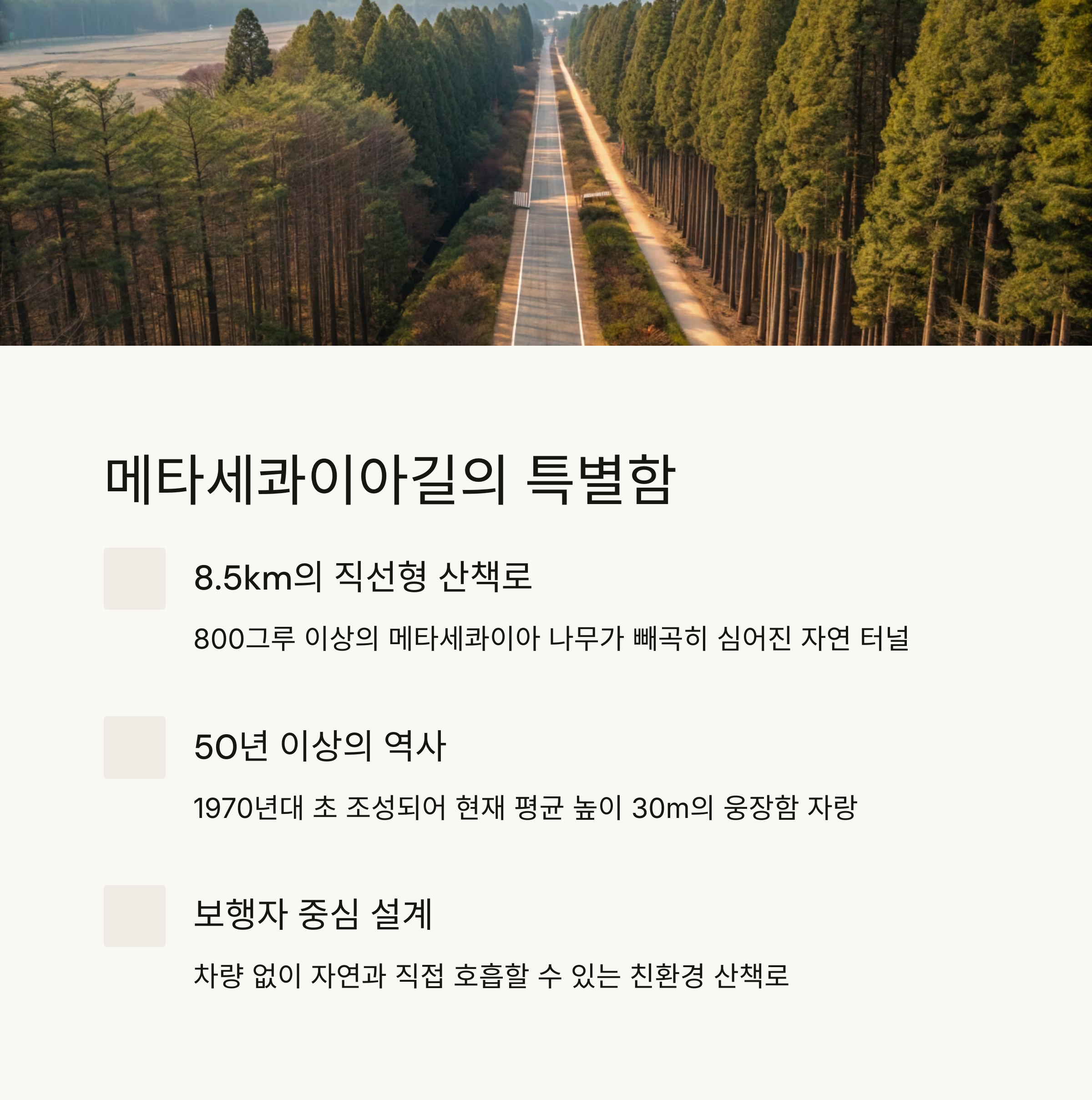 담양 메타세콰이아길은 약 8.5km에 달하는 직선형 산책로로, 길 양옆에 800그루 이상의 메타세콰이아 나무가 빼곡히 심어져 있다. 이 나무들은 1970년대 초, 정부의 가로수 조성 사업의 일환으로 식재되었으며, 현재는 평균 수령 50년 이상, 높이 30m를 자랑한다.