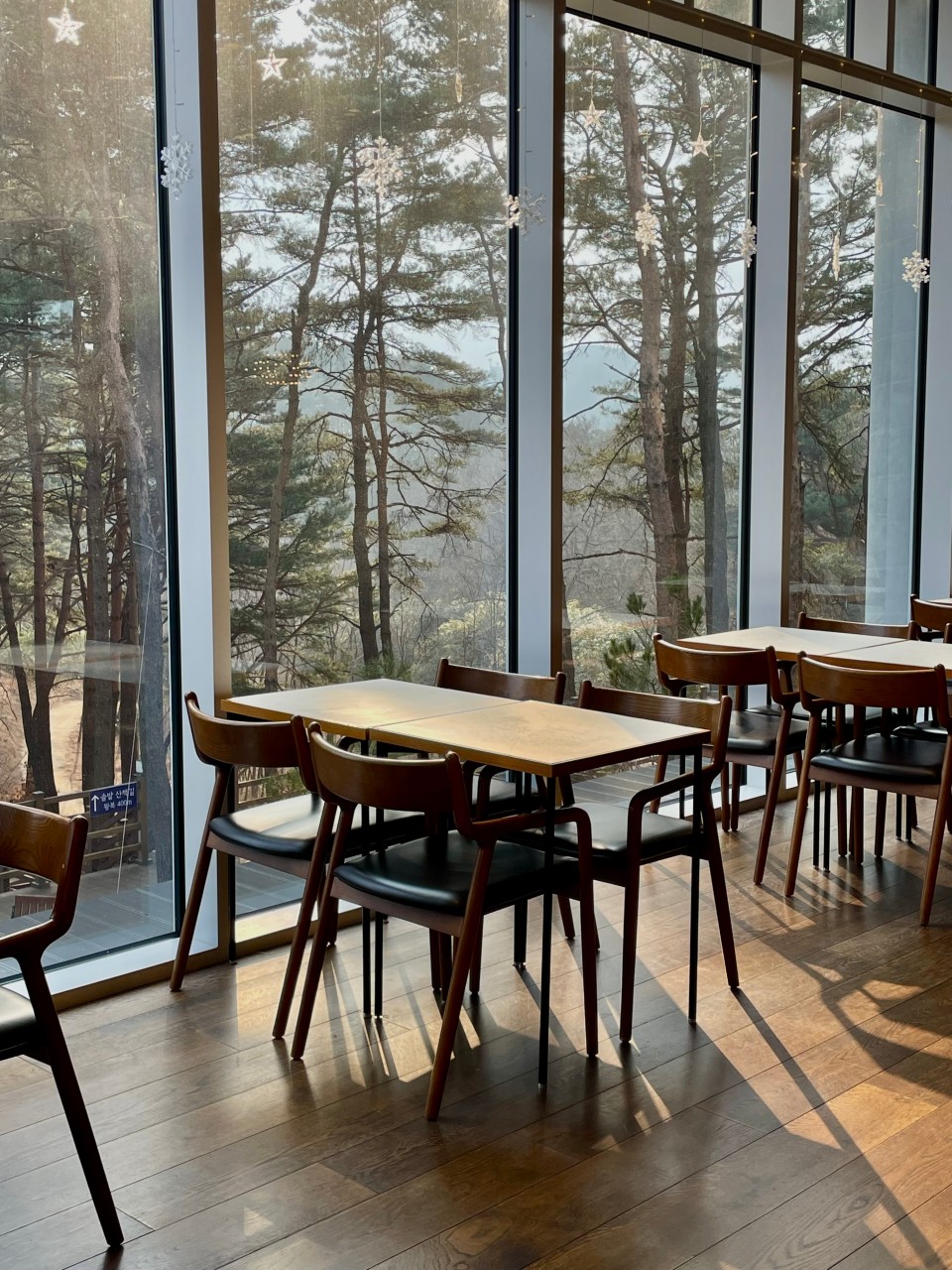 천장이 높고 통유리창이 넓게 나 있어 자연광이 실내를 가득 채우며, 창가에 앉으면 눈앞에 펼쳐진 소나무 숲이 힐링을 선사합니다.