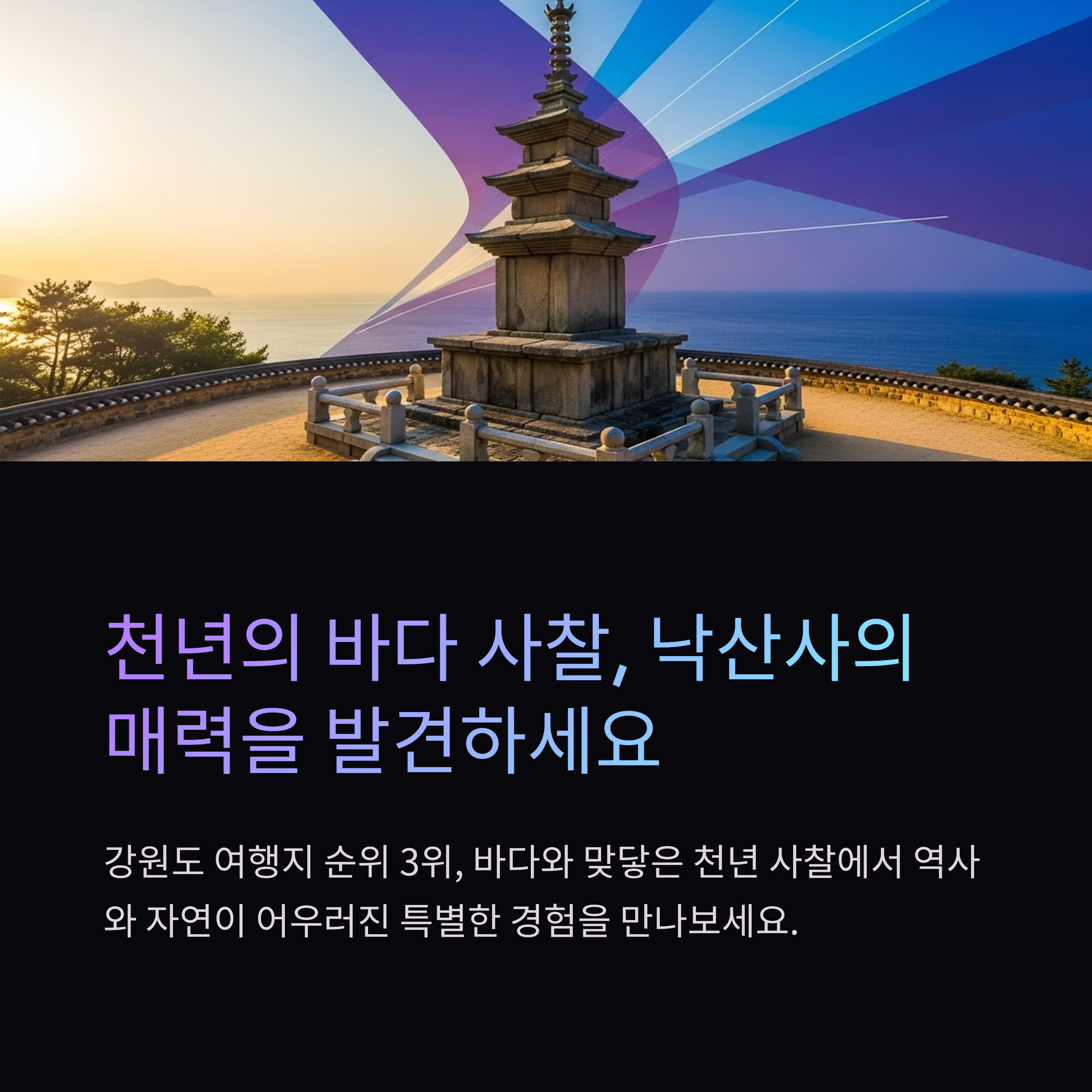 낙산사는 바다와 맞닿은 천년 사찰로, 역사와 자연이 어우러진 강원도의 대표 명소입니다. 의상대사 창건 이래 불교 신앙 중심지로 자리 잡았으며, 동해의 절경 속에서 명상과 치유의 시간을 경험할 수 있는 곳이기도 합니다. 특히 관음보살을 모신 신성한 도량이라는 점에서 신심 깊은 이들에게는 성지와 같은 의미로 다가옵니다. 이번 글에서는 낙산사의 역사, 명소, 체험 프로그램, 주변 여행 코스까지 자세히 소개합니다.