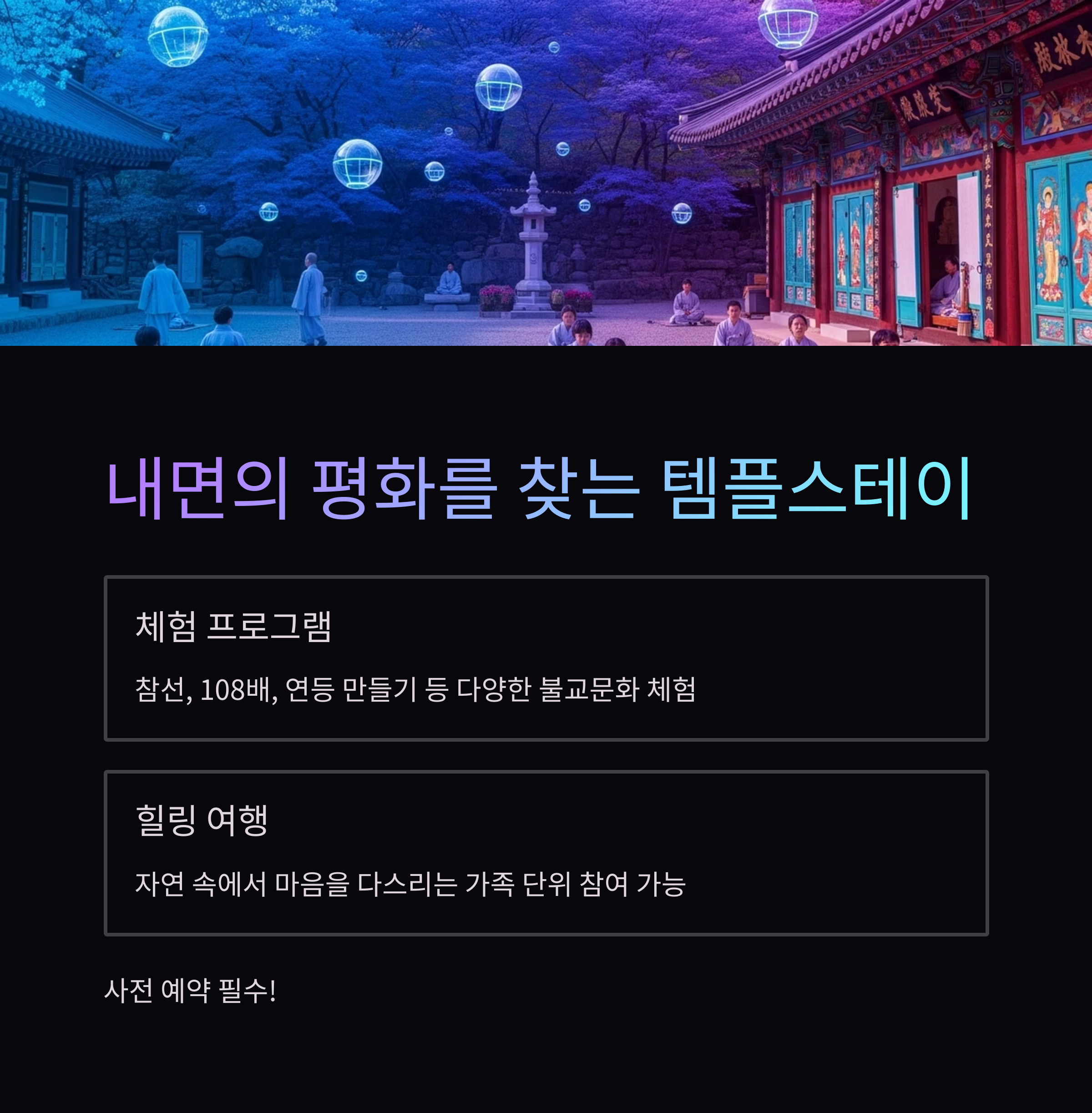 '아름다운 풍경과 사찰 음식 맛보기' 등 다양한 프로그램이 마련되어 있습니다.