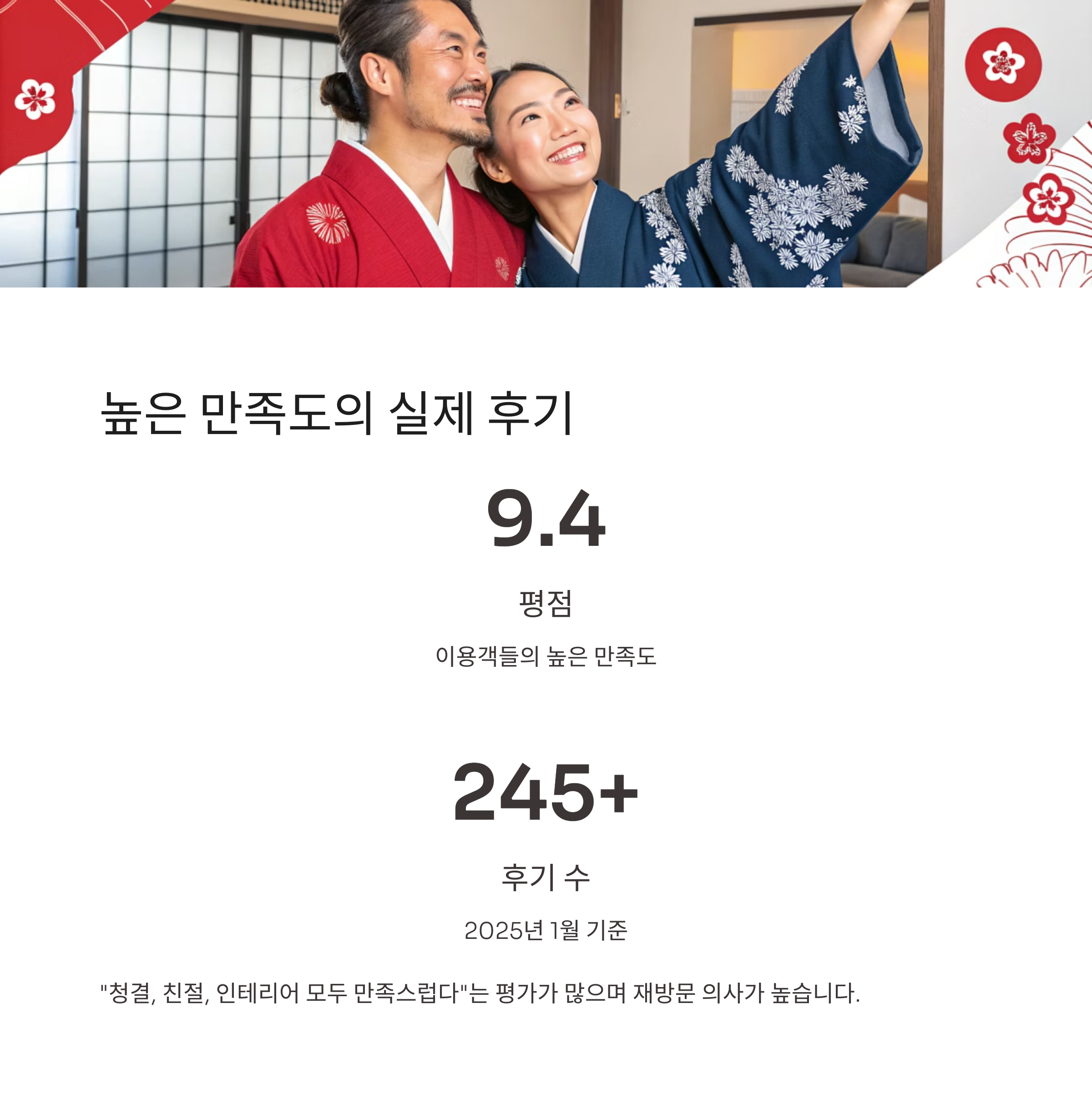 "청결, 친절, 인테리어 모두 만족스럽다"는 평가가 많습니다.
