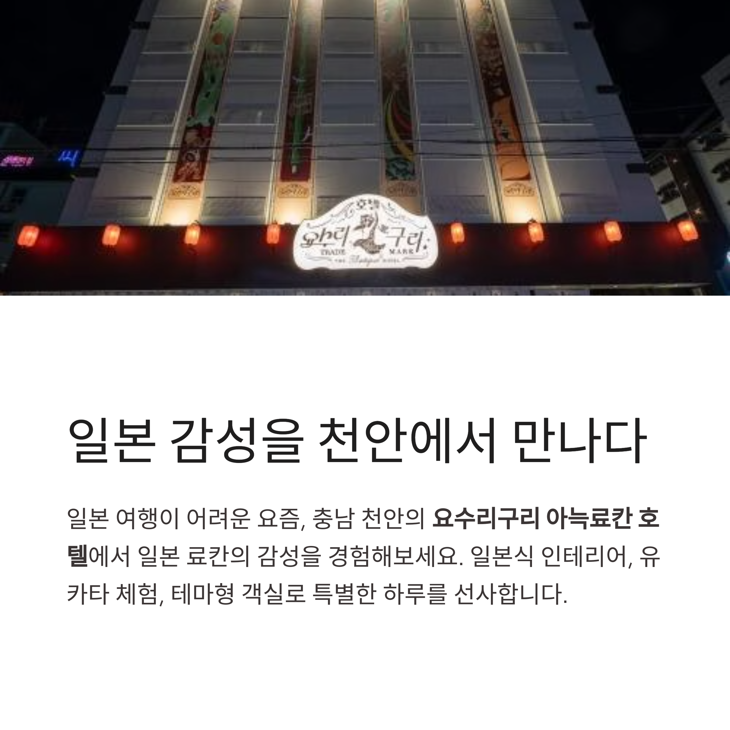 요수리구리 아늑료칸 호텔은 천안에서 일본 료칸 감성을 가장 잘 구현한 숙소로 손꼽힙니다. 짧은 여행이더라도 특별한 추억을 만들고 싶은 분들께 필수 방문지로 추천드립니다.