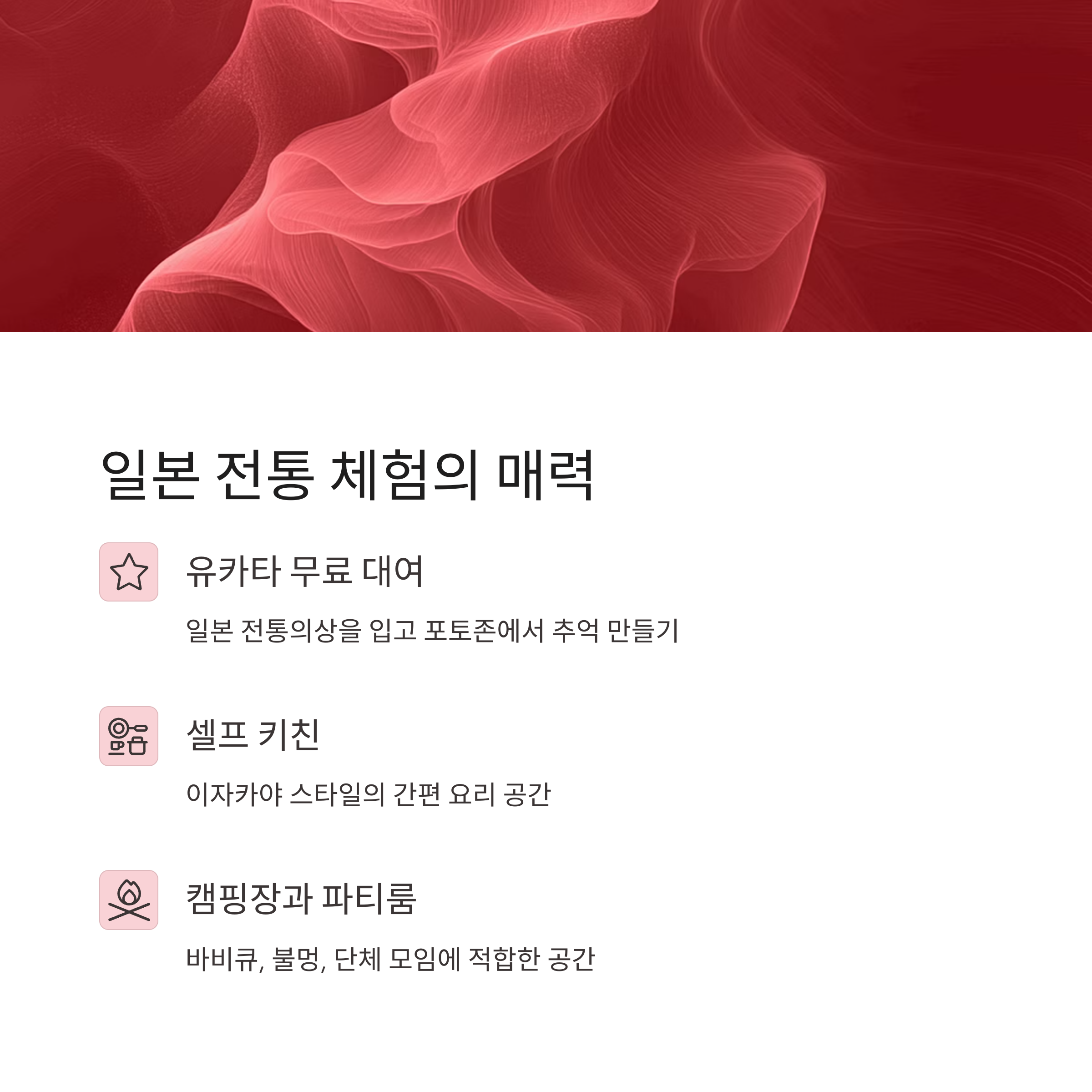 | 부대시설 | 유카타 대여, 셀프 키친, 파티룸, 캠핑장 등 |