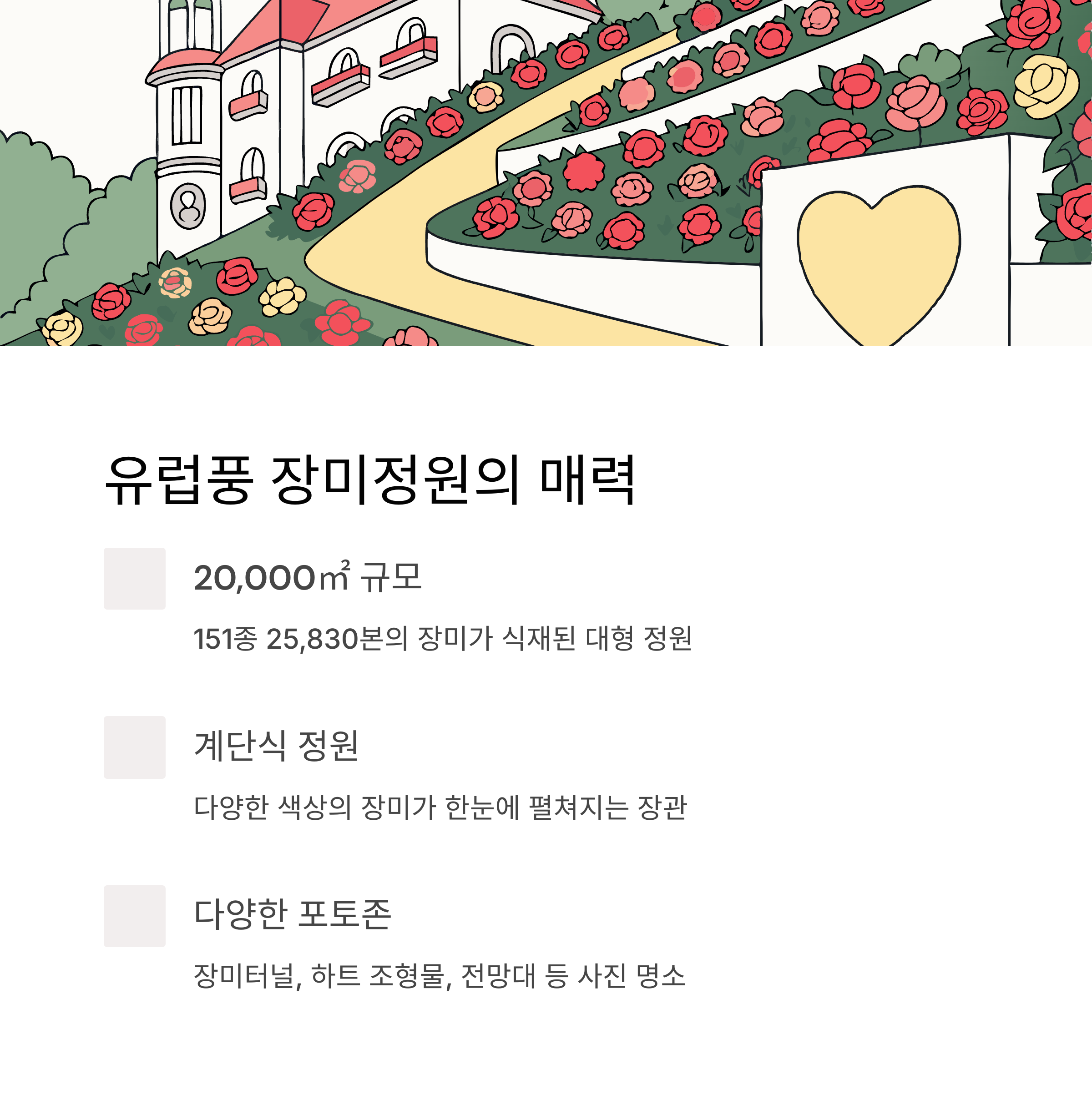 | 주요 볼거리 | 151종 장미, 유럽풍 정원, 포토존, 체험 프로그램 |