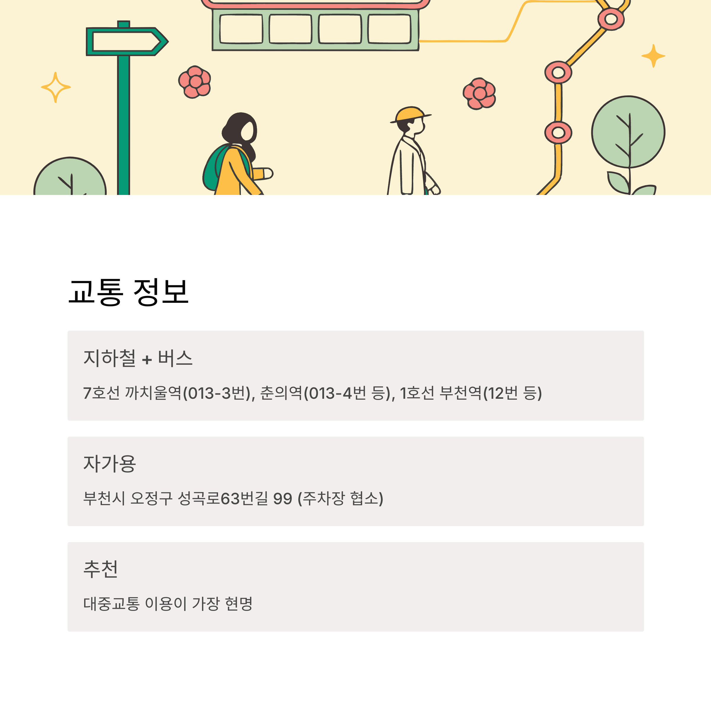 | 1호선 부천역 4번 출구 | 12번, 50번, 70-2번, 661번 (도당동행정복지센터 하차) |