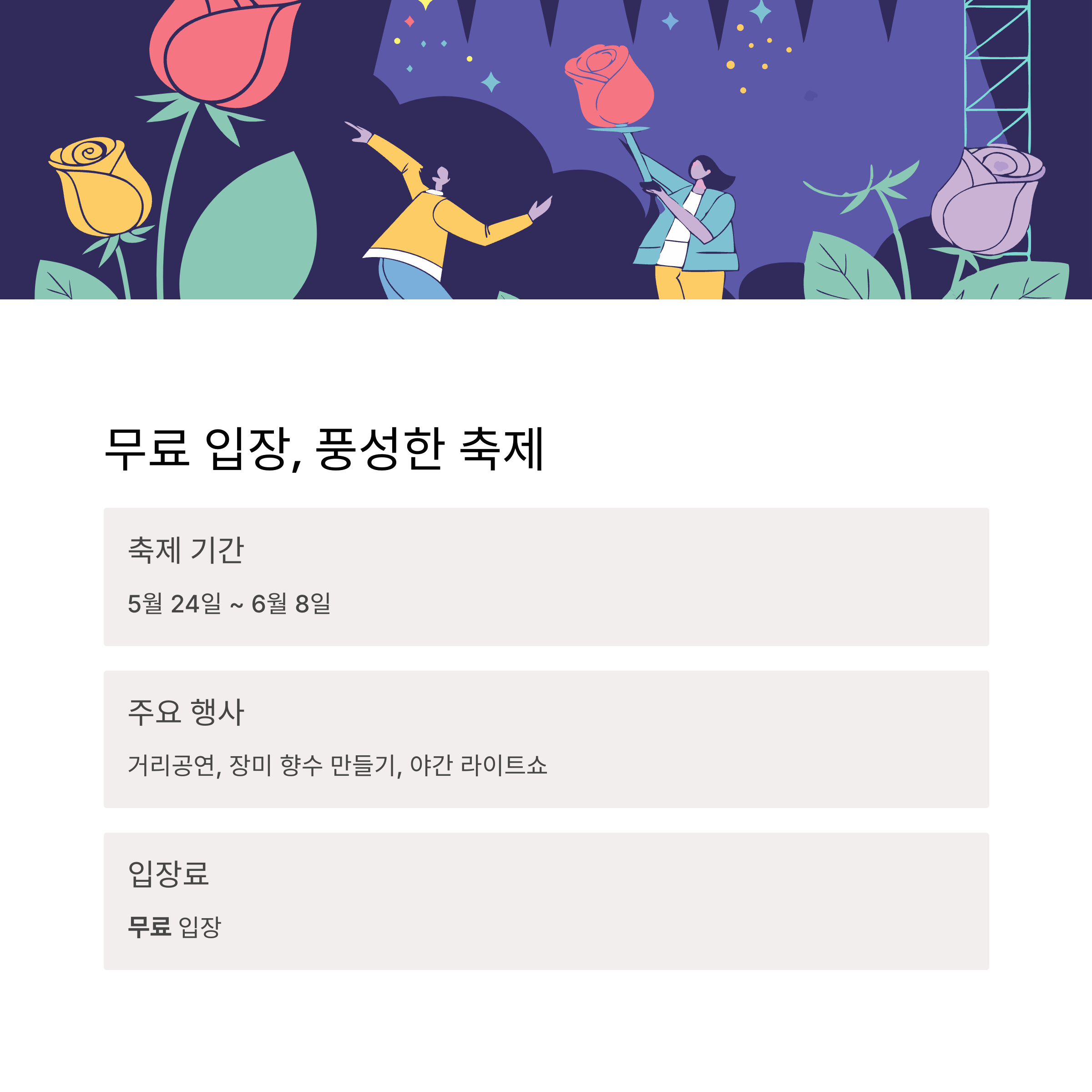 | 추천 시기 | 5월 말~6월 초 (장미 만개 시기) |