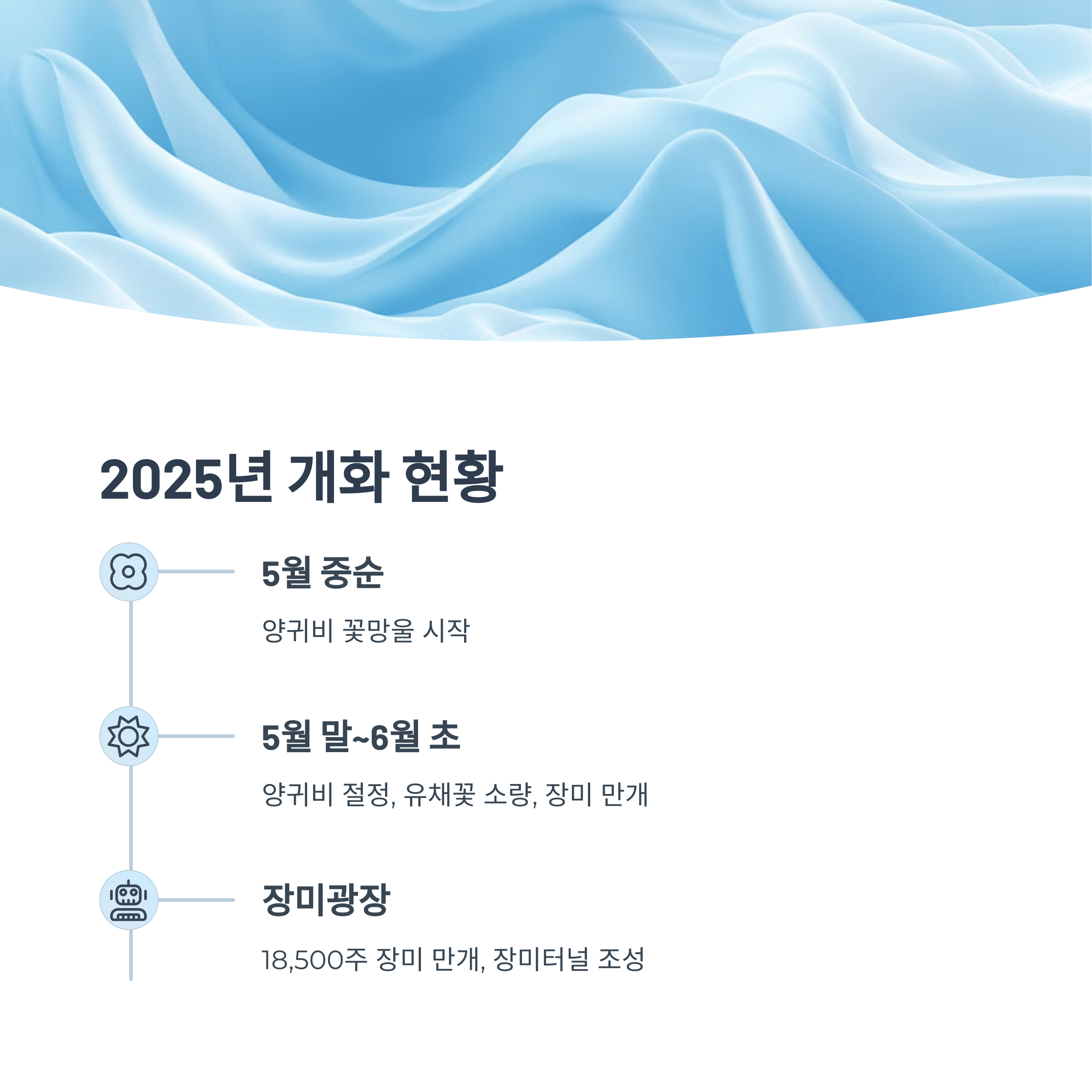 | 주요 개화 시기 | 5월 중순 ~ 6월 초 (양귀비·장미 동시 만개) |