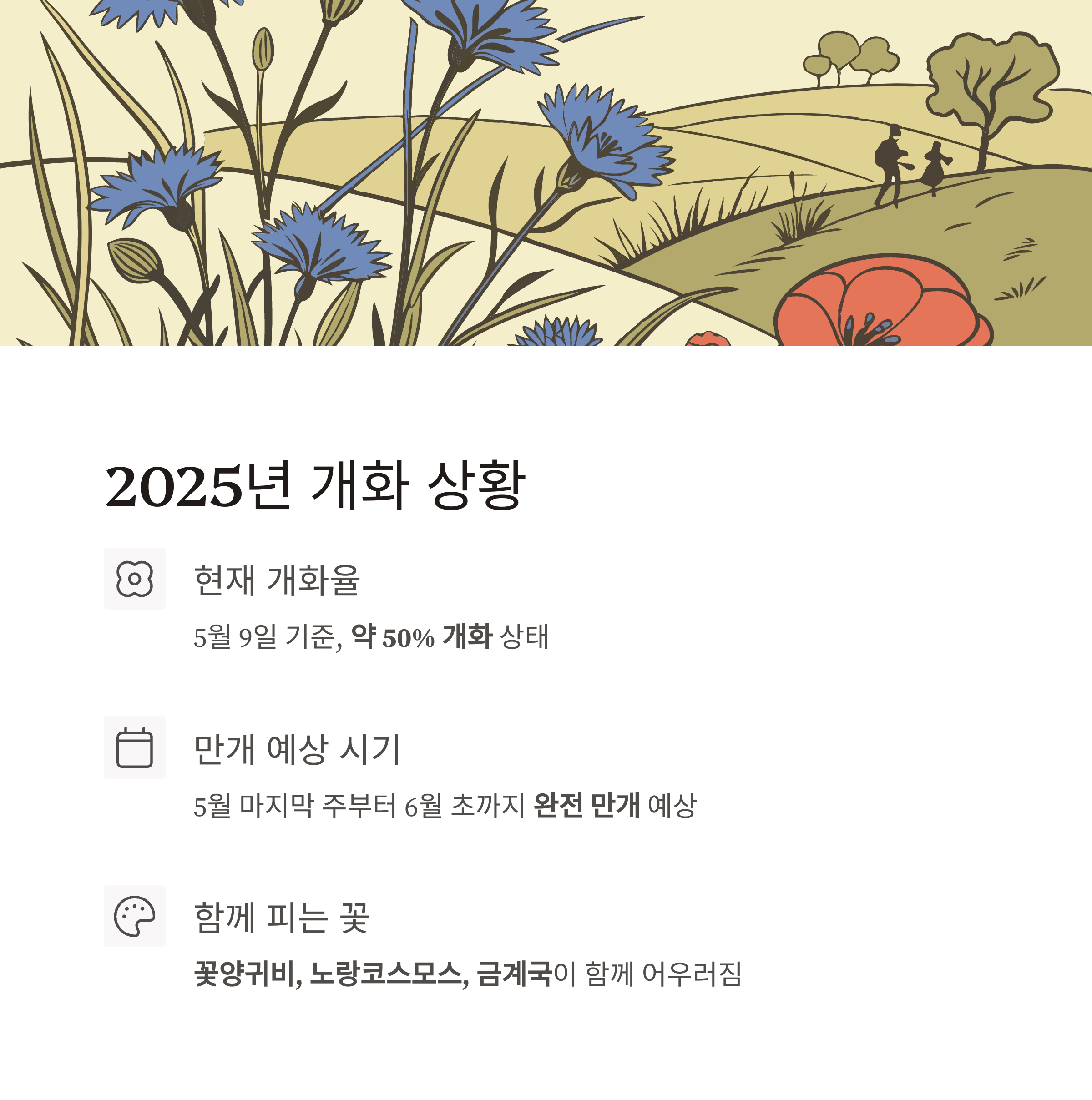 2025년 5월 현재, 수레국화가 절정에 달하며 가족, 연인, 사진가들의 발길이 끊이지 않고 있습니다.