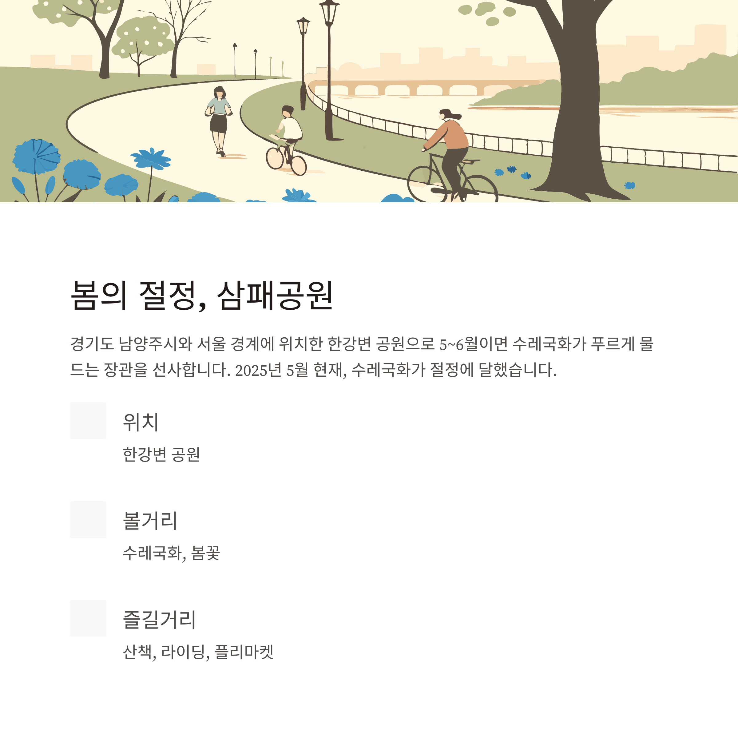 다양한 봄꽃과 함께 산책, 라이딩, 플리마켓까지 즐길 수 있는 삼패공원으로