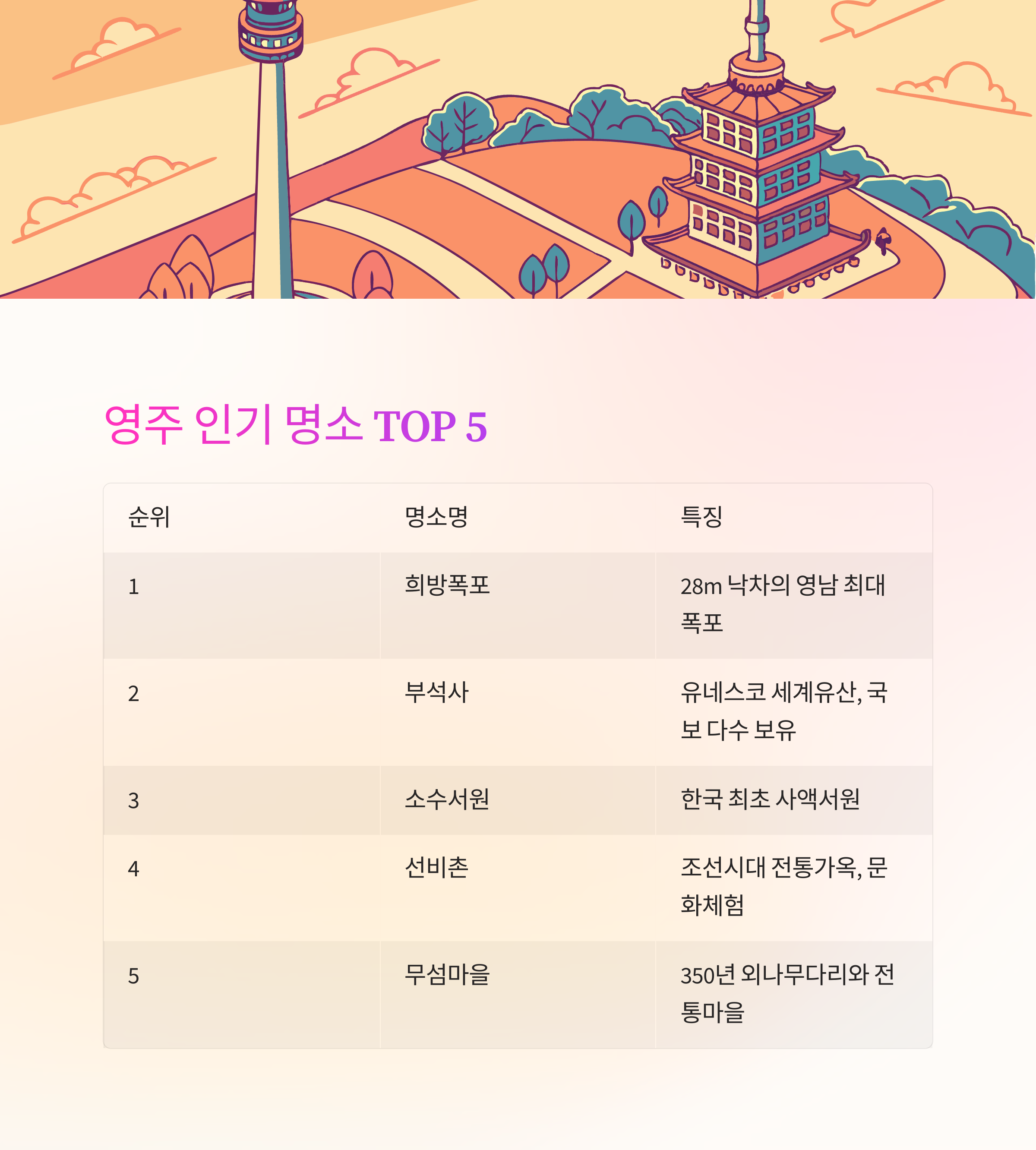 아래 표를 통해 영주의 인기 명소를 비교해 보세요.