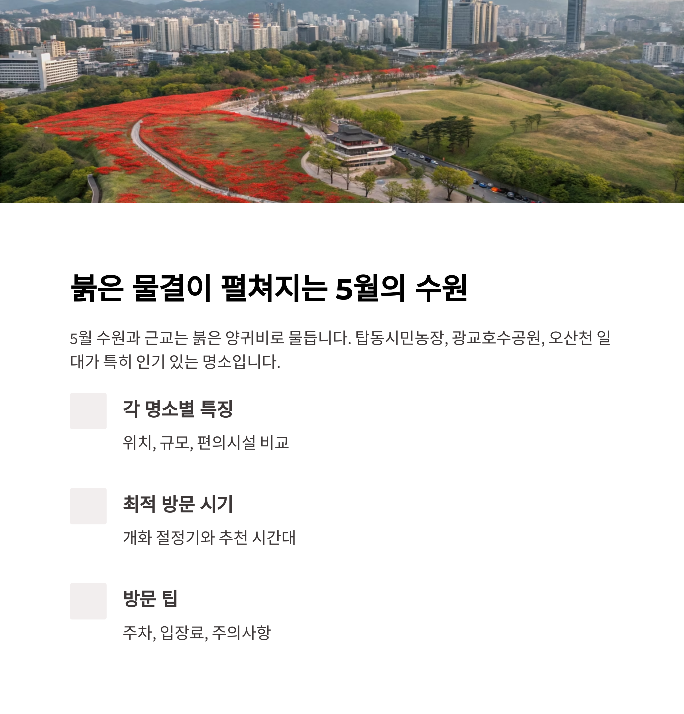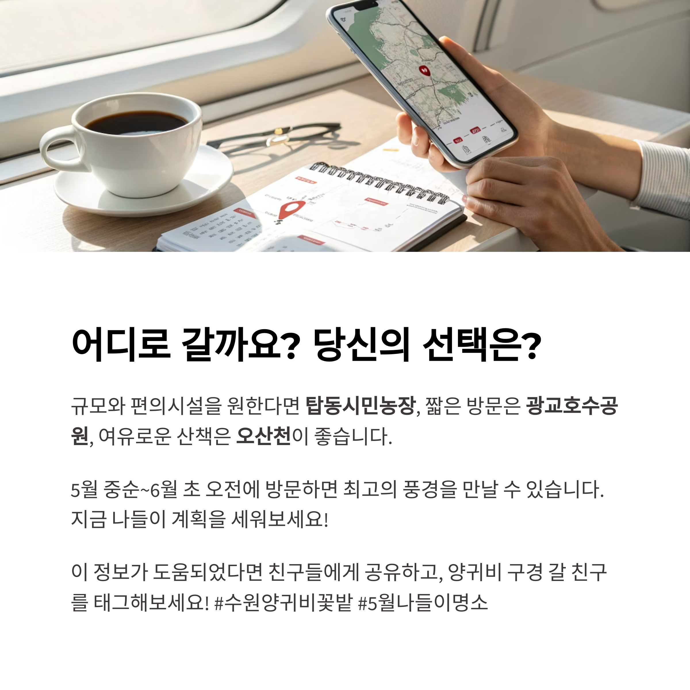 특히 탑동시민농장, 광교호수공원, 오산천 일대는 최근 방문자 후기와 기사에