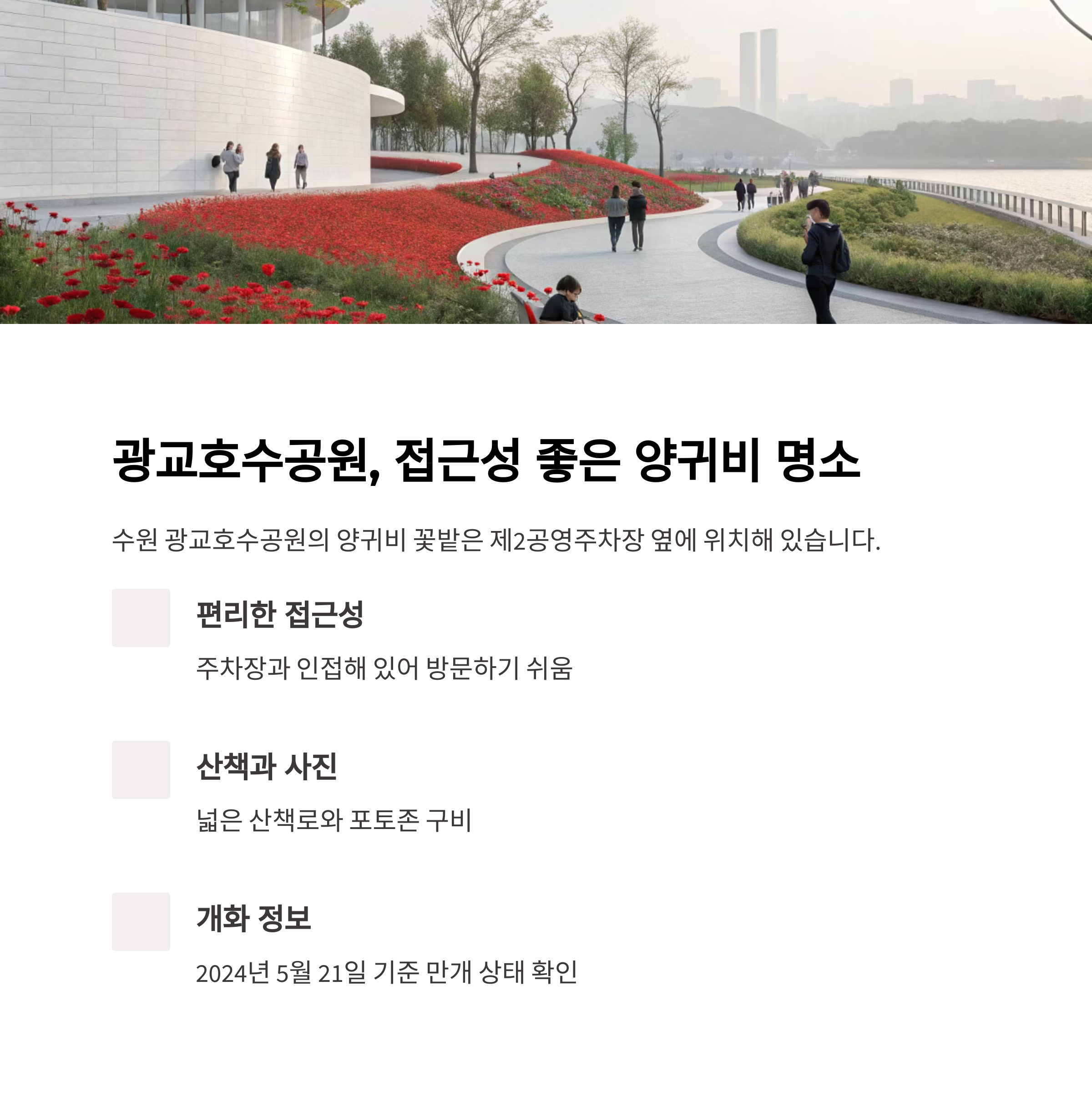 | 광교호수공원 | 수원 광교호수공원 | 대형 공영주차장 | 무료 | 5월 하순 | 접근성 우수, 산책로 |