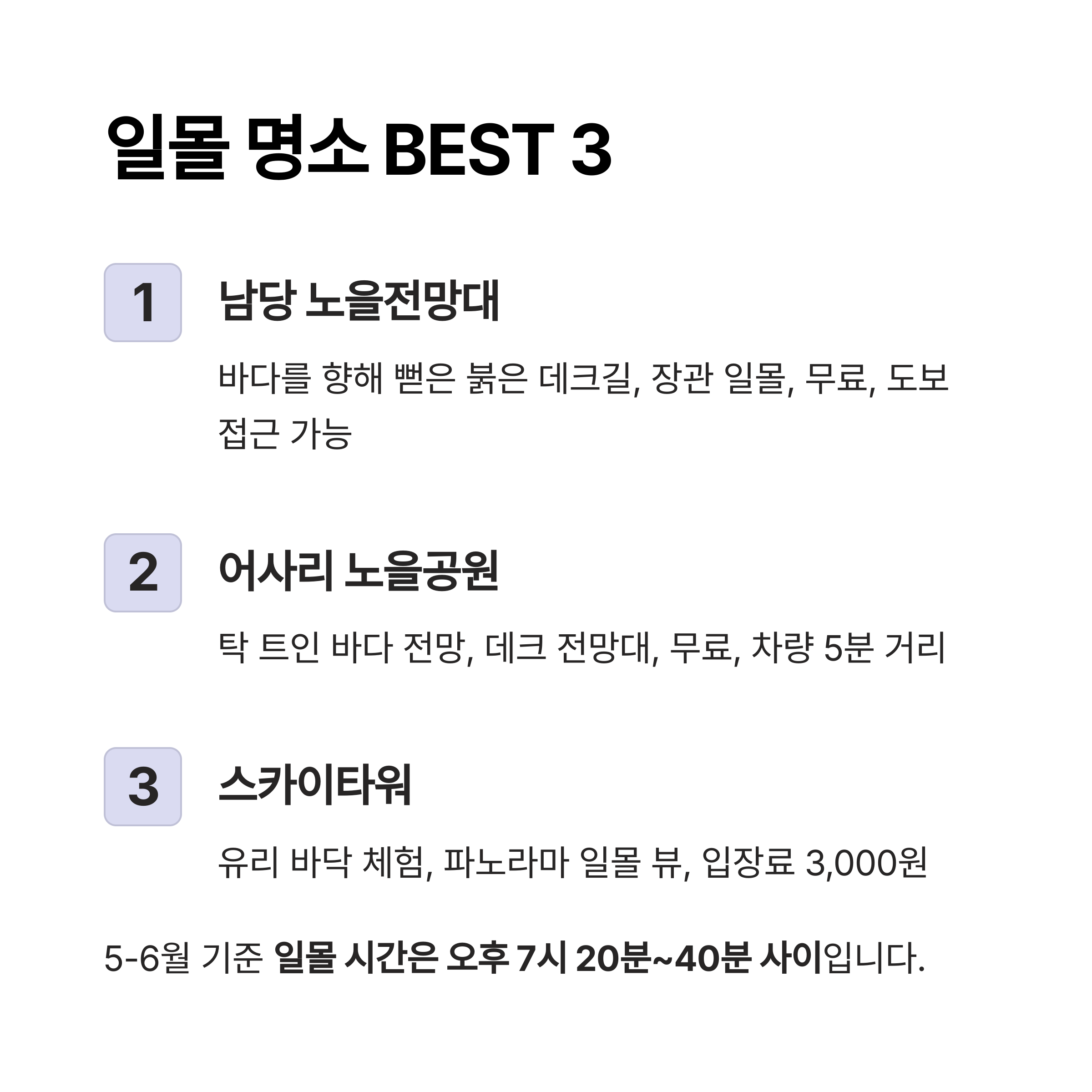 일몰 명소 BEST 3, 노을 감상 포인트 비교
