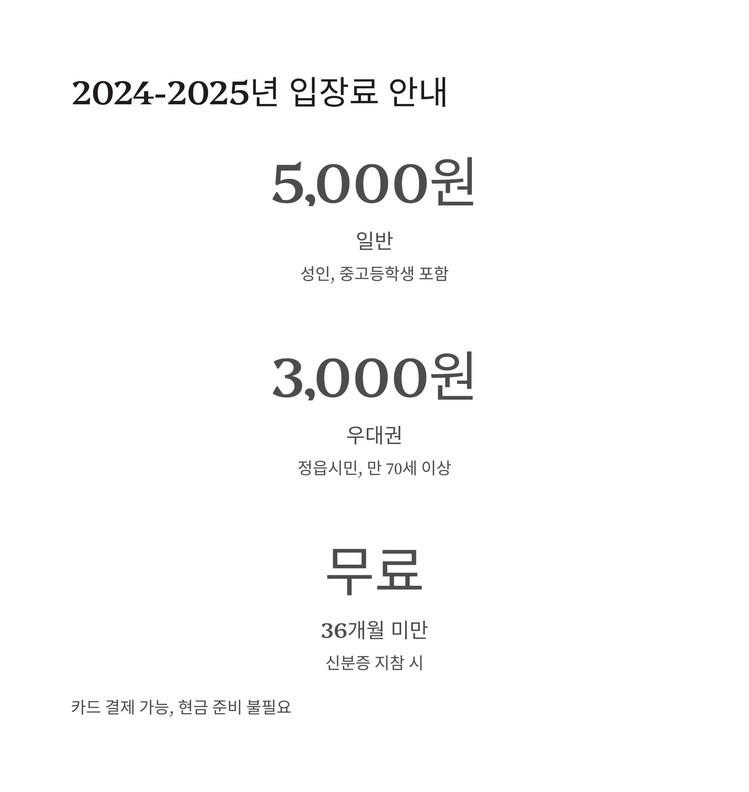 | 우대권 | 3,000원 | 정읍시민, 만 70세 이상, 3급 이상 장애인, 36개월~13세 |