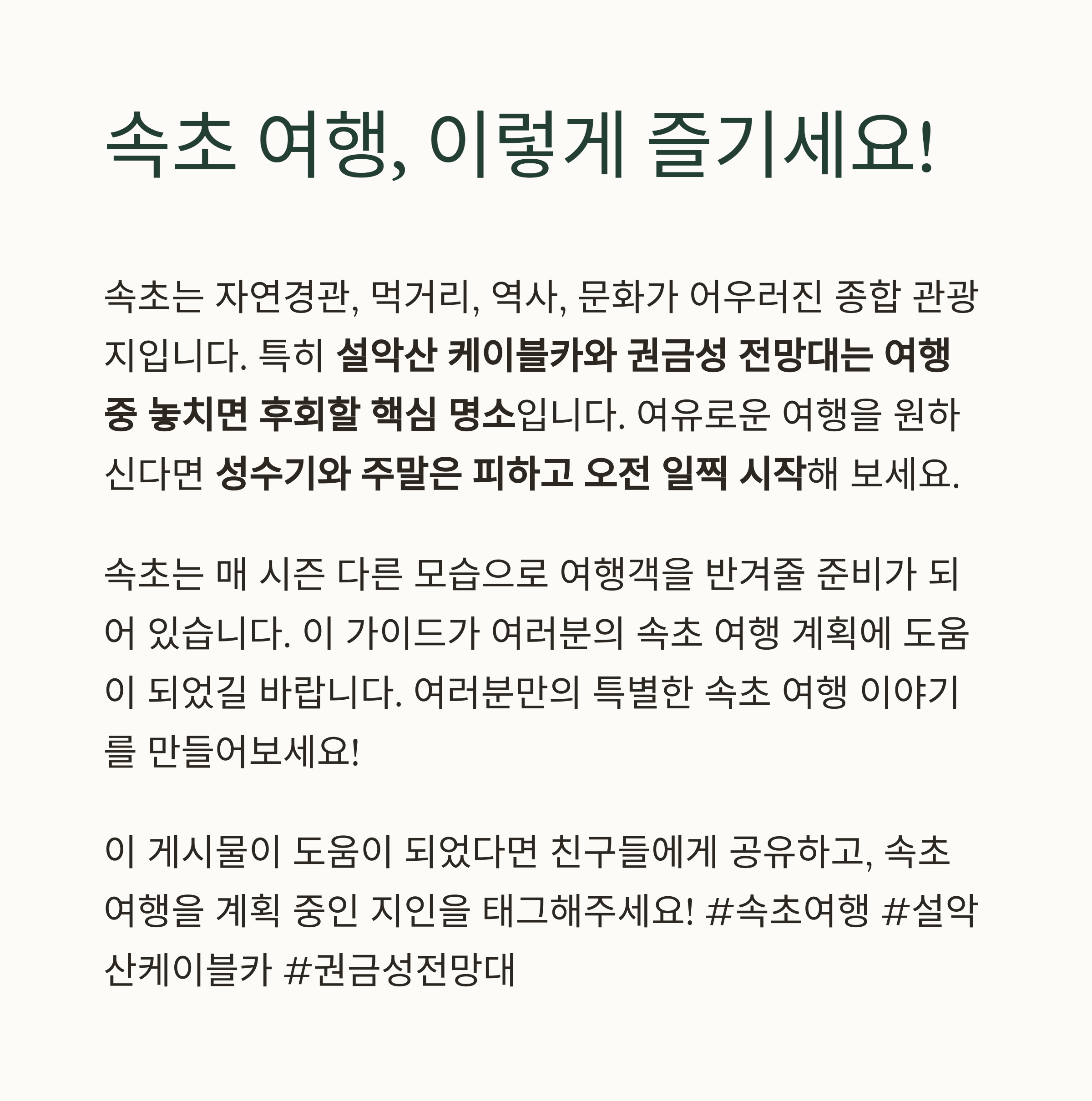 특히 설악산 케이블카와 권금성 전망대는 여행 중 놓치면 후회할 핵심 명소입니다.