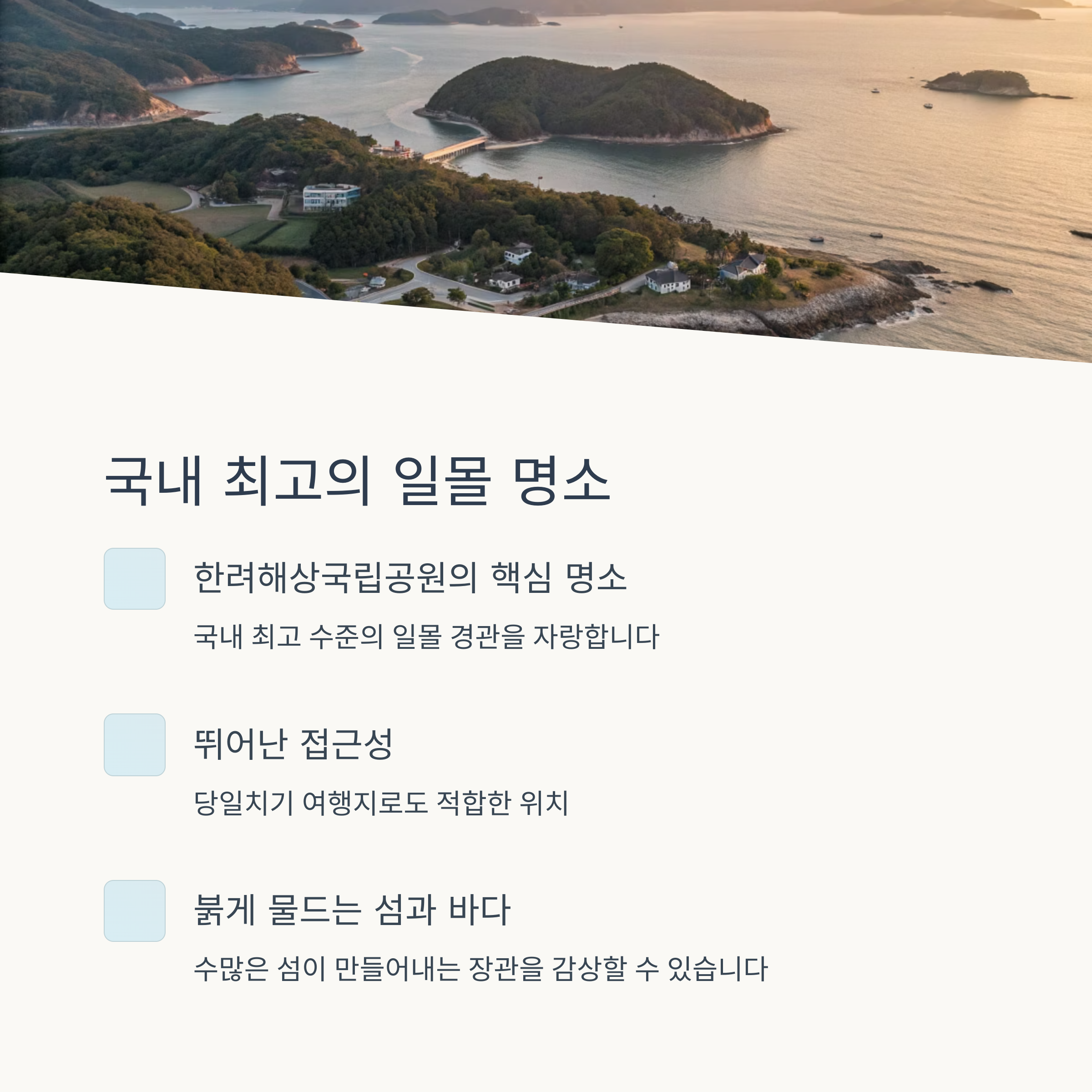 경상남도 통영시에 위치한 달아공원과 달아전망대는 한려해상국립공원의 핵심 명소로, 국내 최고 수준의 일몰 경관을 자랑합니다. 접근성이 좋아 당일치기 여행지로도 적합하며, 수많은 섬과 바다가 붉게 물드는 장관을 감상할 수 있어 일몰 시간대엔 늘 많은 여행자들이 찾습니다.