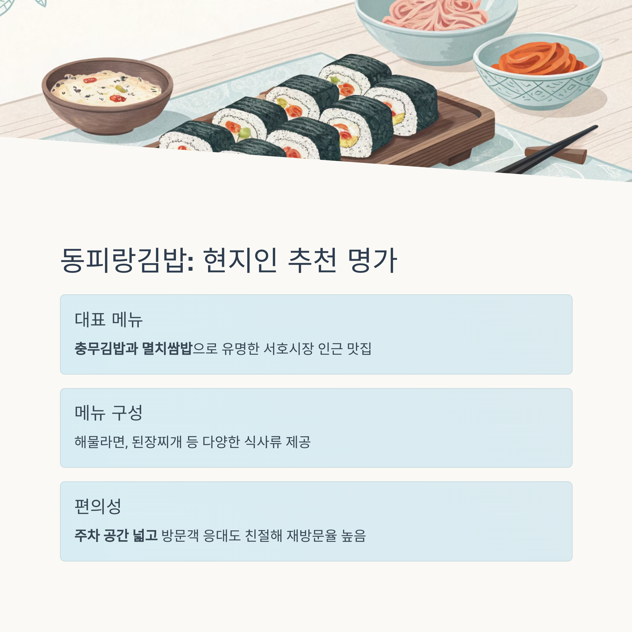 동피랑김밥은 충무김밥과 멸치쌈밥으로 명성이 자자한 서호시장 인근 맛집입니다