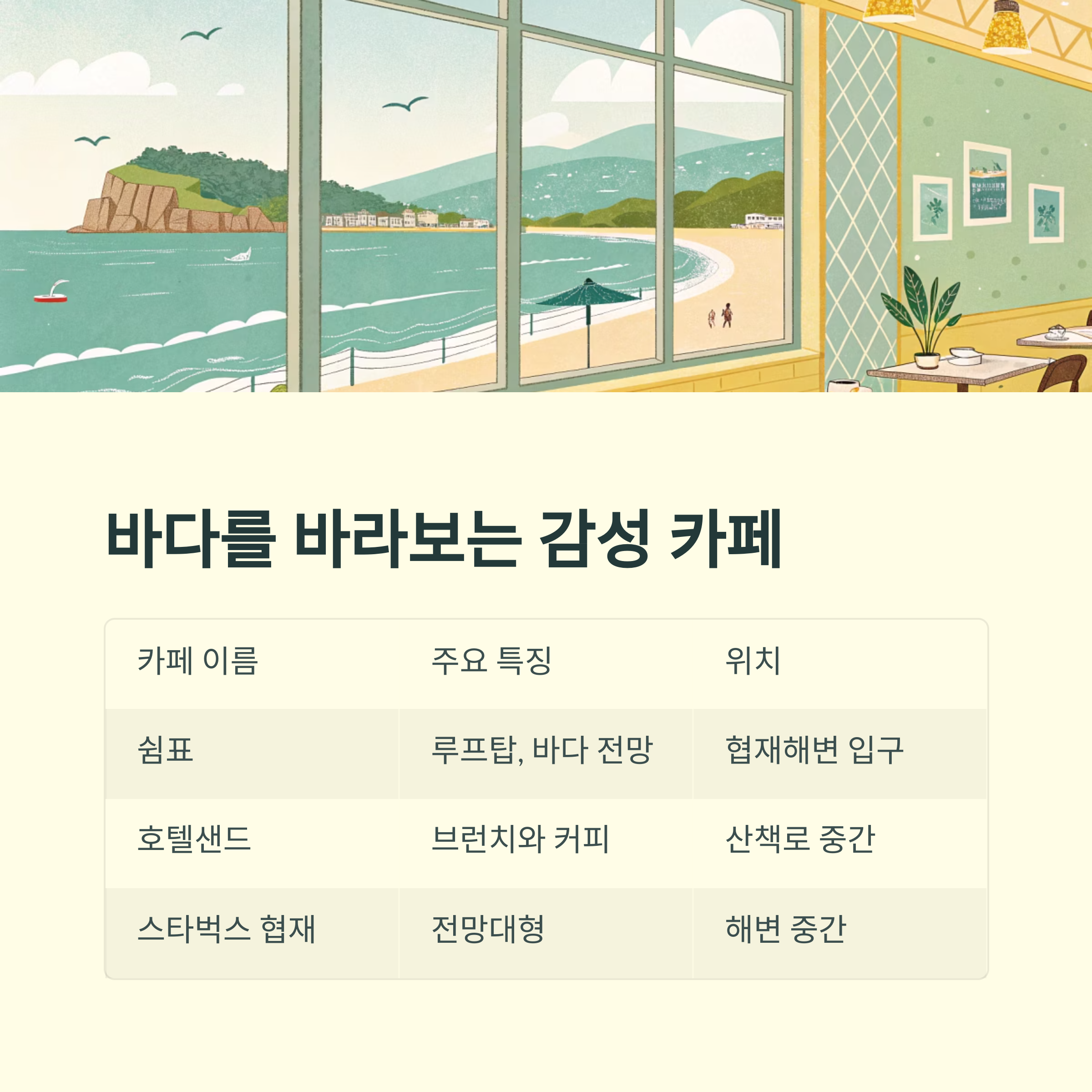 | 스타벅스 협재 | 글로벌 체인, 전망대형 | 협재해변 중간 위치 |