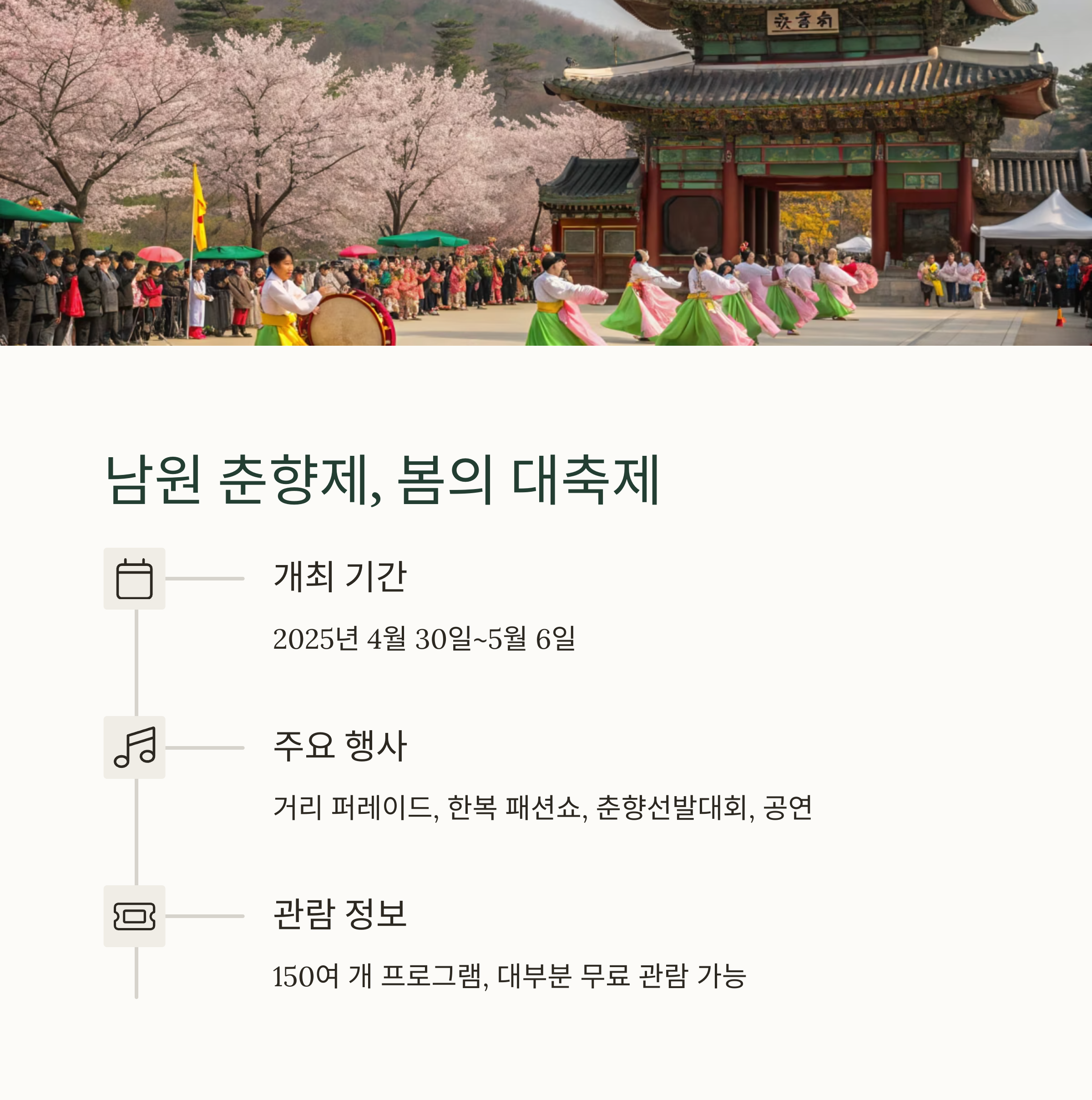 대표 명소, 축제, 벚꽃 개화 정보, 추천 코스 등을 최신 데이터로 정리해 보겠습니다. 남원의
