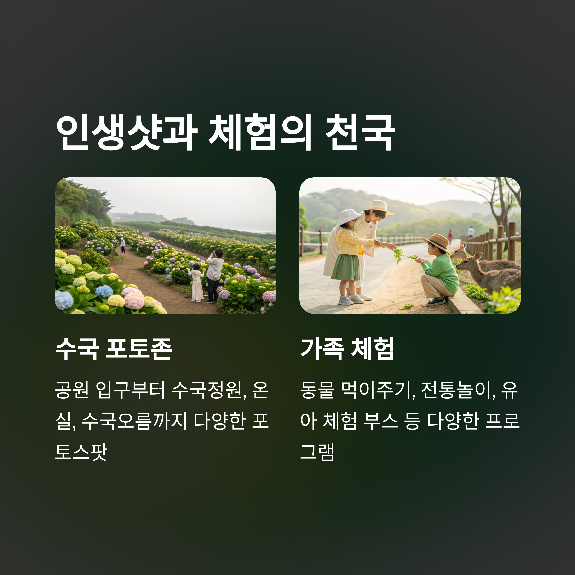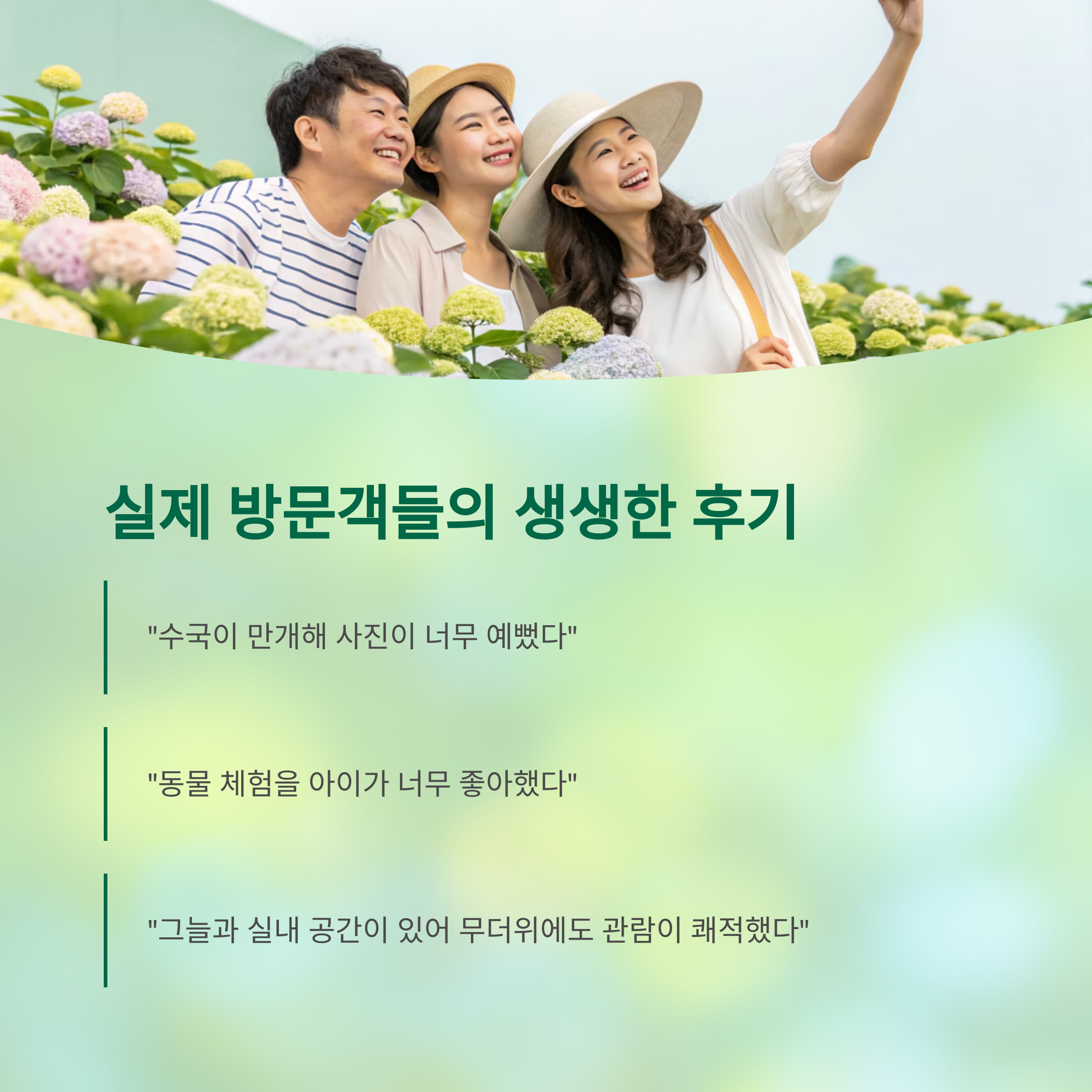 | 주요 프로그램 | 수국 포토존, 동물 먹이주기, 자연학습, 전통놀이 |