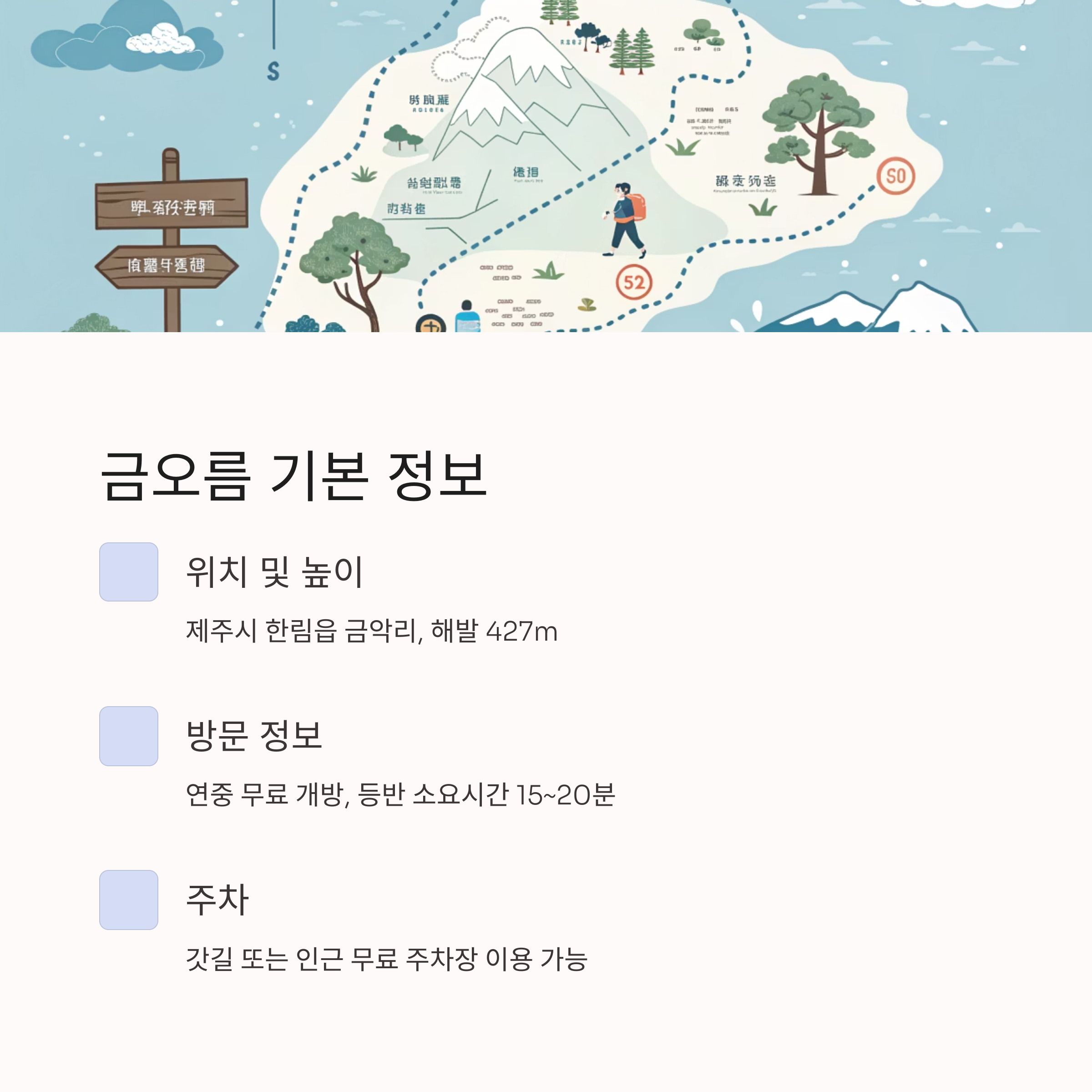 금오름은 제주 제주시 한림읍 금악리에 위치하며, 해발 약 427m 높이의 오름입니다. 연중 무료 개방되며 주차는 갓길이나 인근 무료 주차장을 이용하실 수 있습니다. 등반 소요 시간은 약 15~20분으로, 짧지만 제주의 자연을 깊이 느낄 수 있는 여정을 제공합니다.