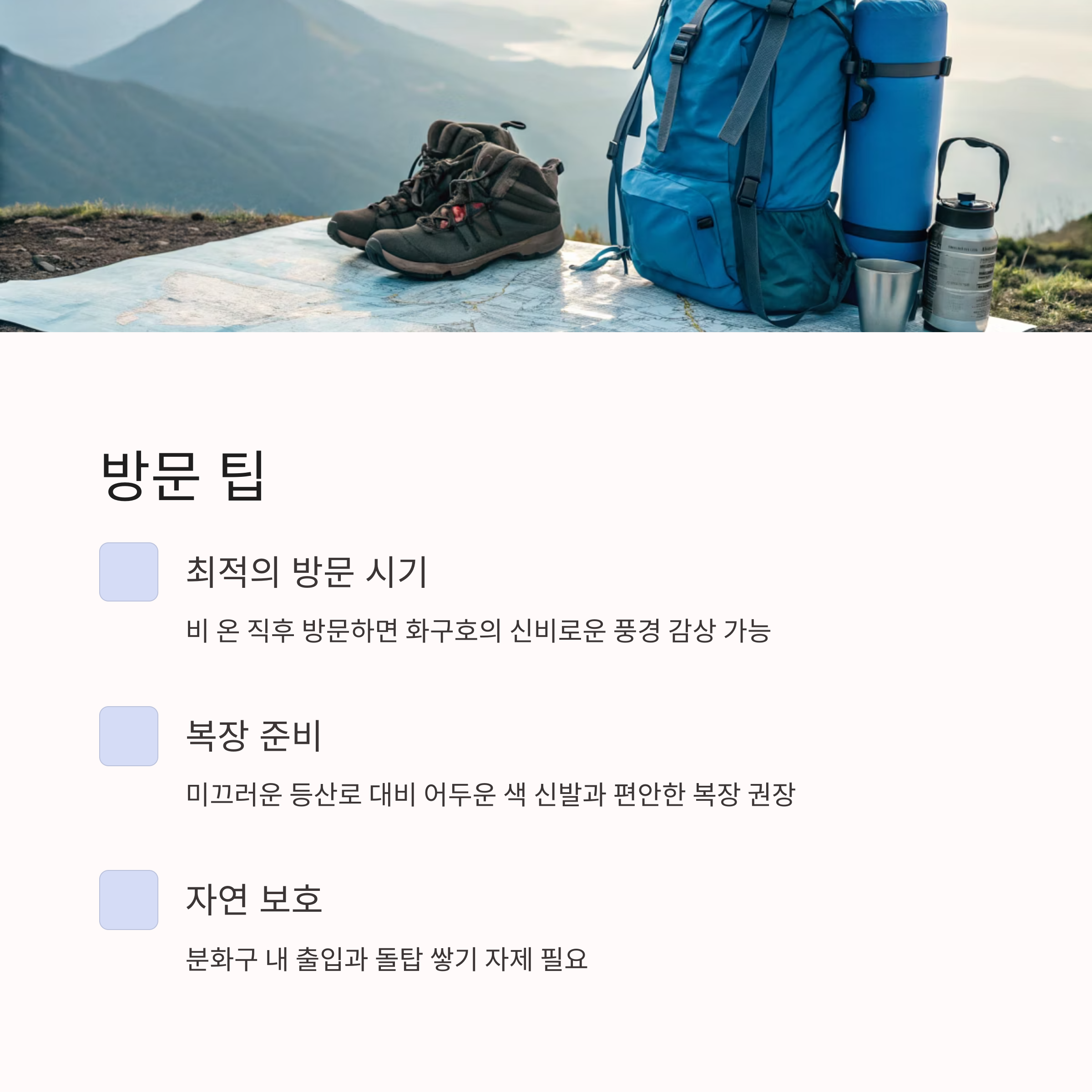 비 온 직후 방문하면 화구호의 신비로운 풍경을 볼 수 있으며,