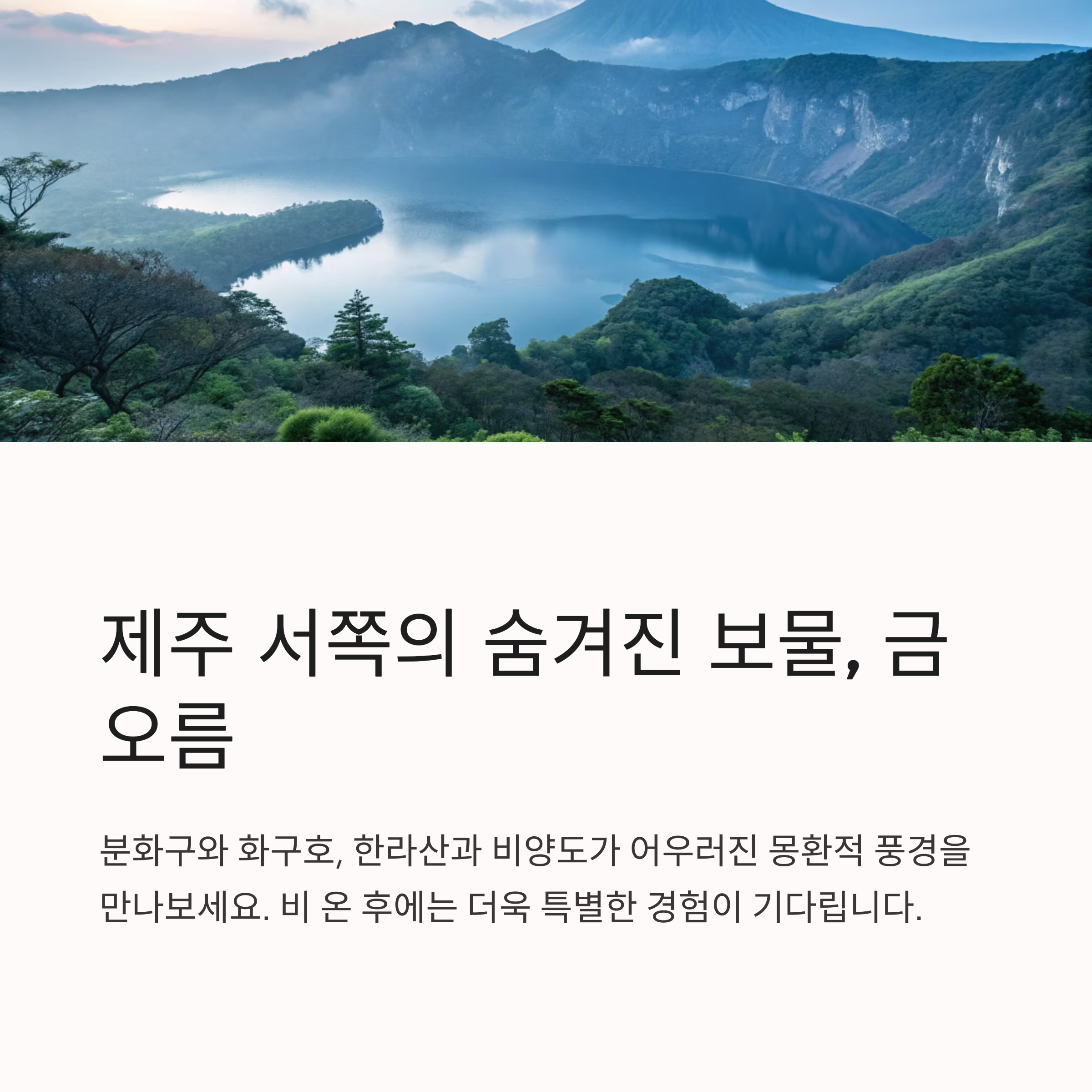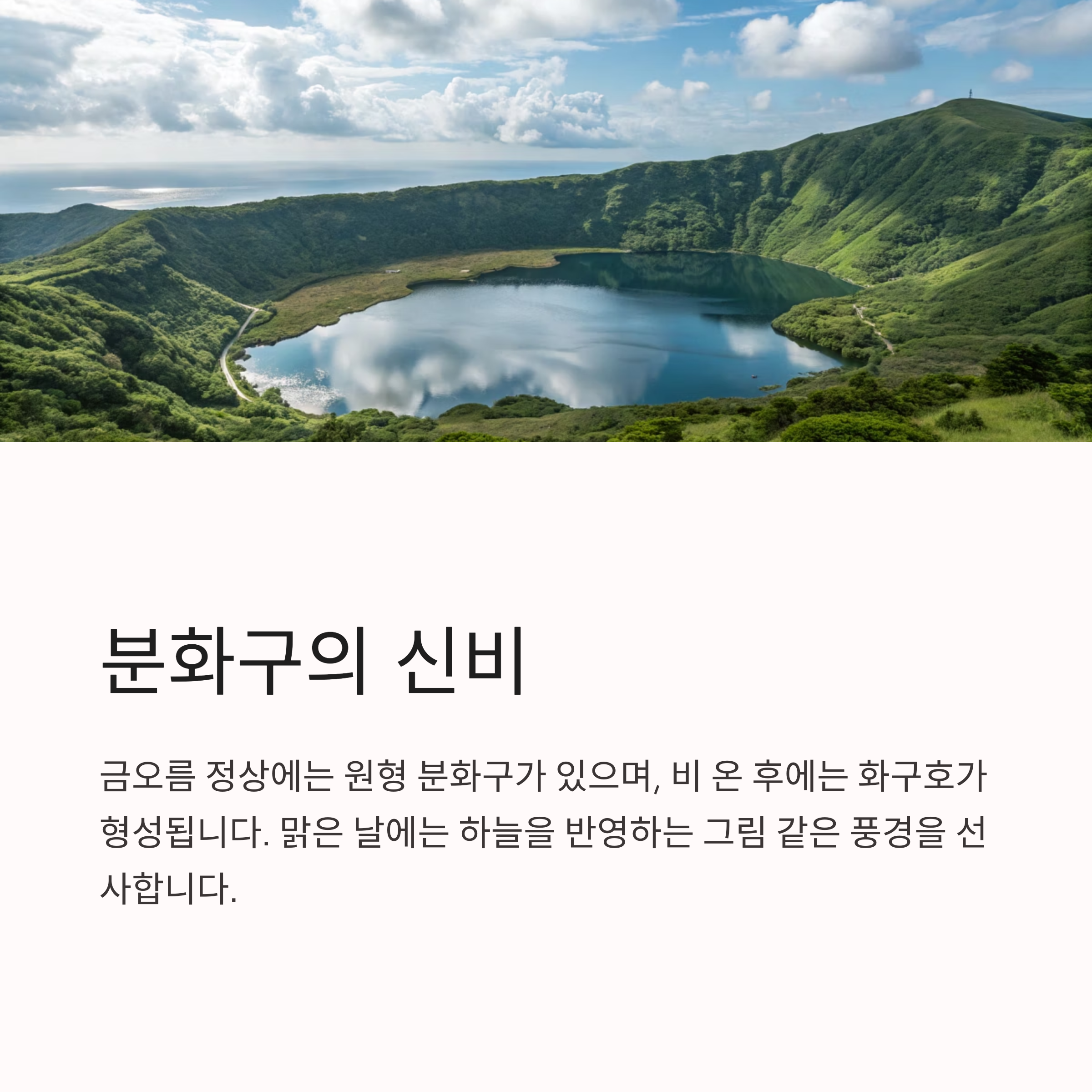 금오름은 제주 서쪽에 자리한 오름으로, 분화구와 화구호, 그리고 한라산과 비양도가 어우러지는 광활한 경관으로 유명합니다. 비가 내린 뒤에는 분화구에 고인 물이 작은 백록담처럼 변해 몽환적 분위기를 자아내며, 자연과 생태계가 공존하는 모습을 가까이에서 체험하실 수 있습니다. 이번 글에서는 금오름의 등반 코스, 분화구와 화구호, 생태적 가치와 현장 보전 노력, 방문 팁까지 자세히 안내드립니다.