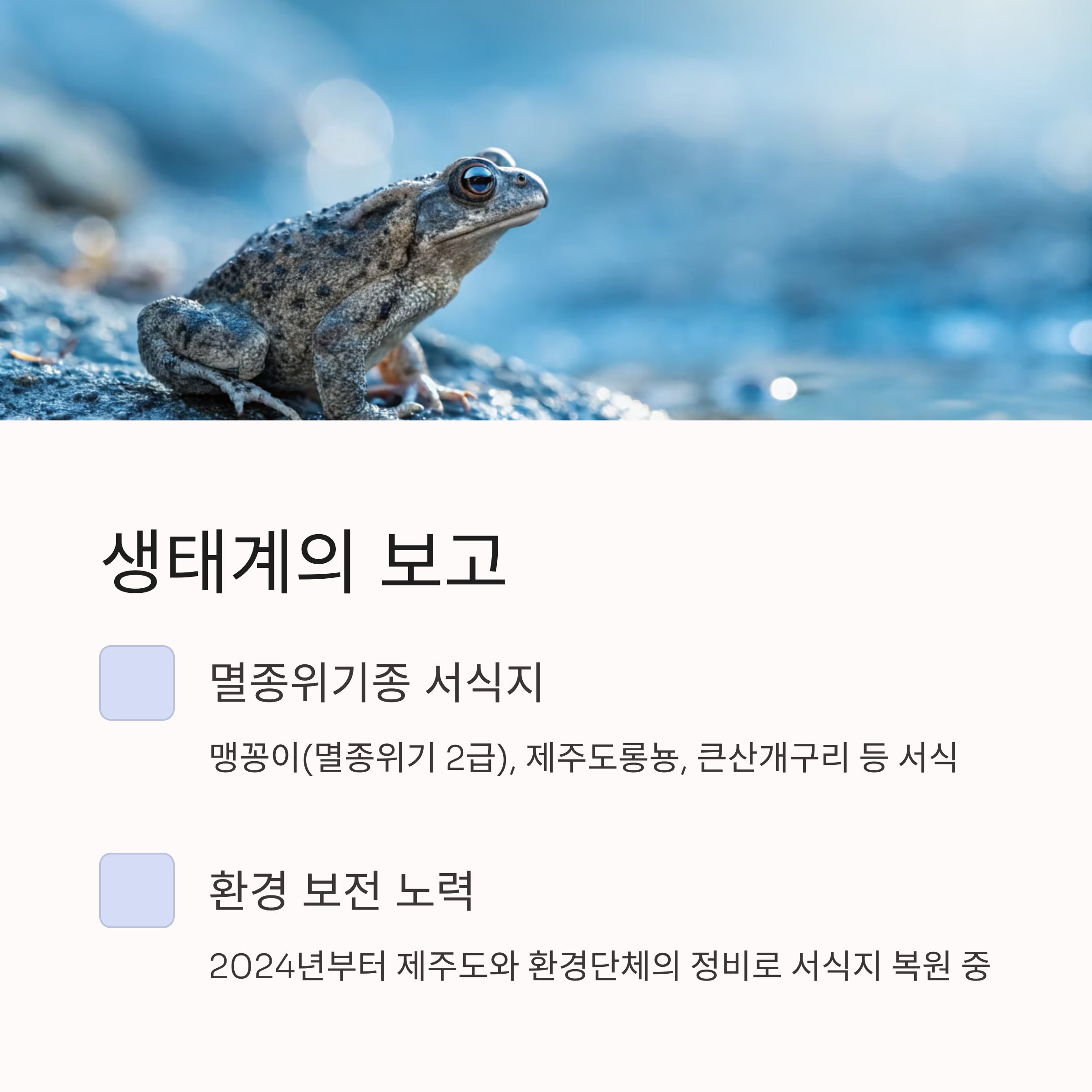 | 맹꽁이 | 멸종위기 야생생물 2급, 분화구 내 서식 |