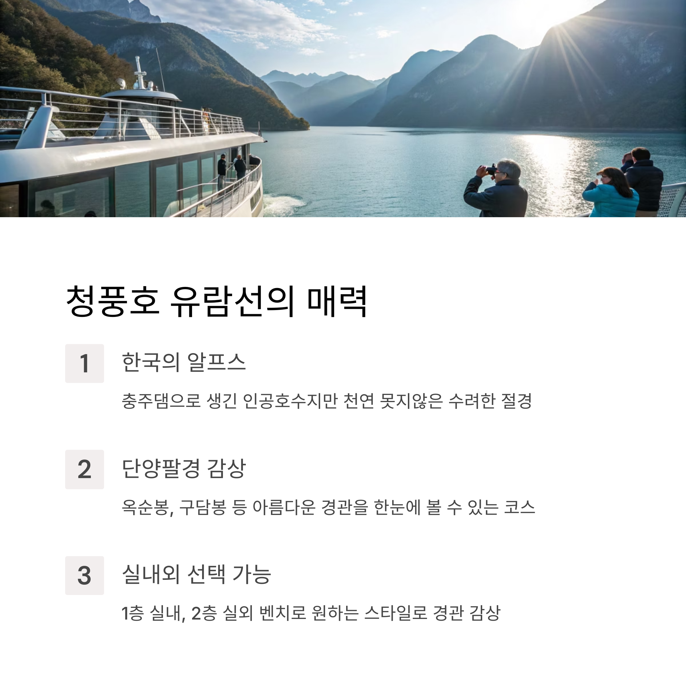 특히 옥순봉, 옥순대교, 청풍호전망대 등 제천의 유명 관광 포인트를 한눈에 볼 수 있어, 여행 효율도 높습니다.