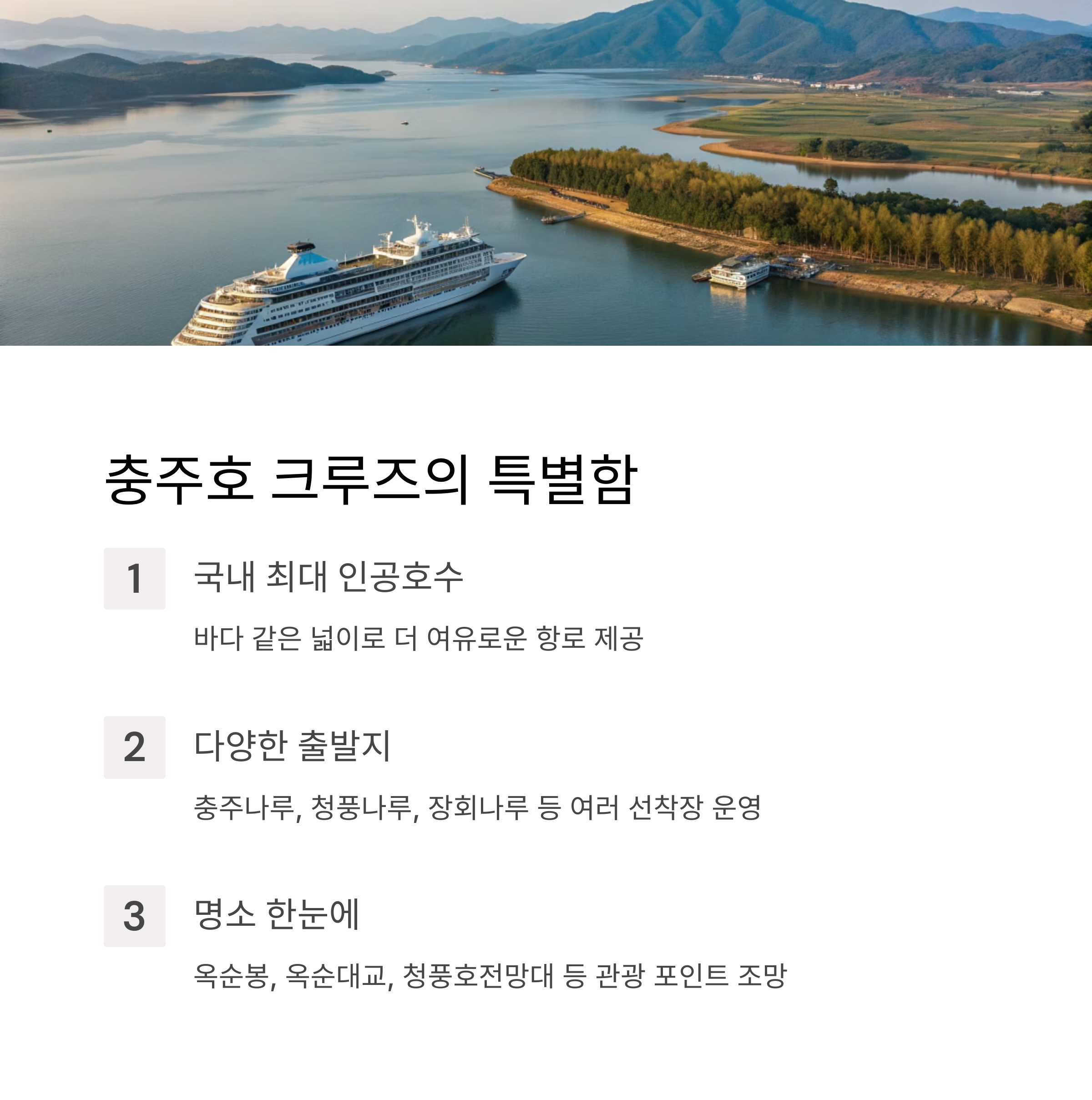 충주호는 국내 최대 인공호수로, 그 넓이는 마치 바다 같습니다. 충주나루, 청풍나루, 장회나루 등 주요 선착장에서 크루즈가 출발하며, 다양한 자연 포인트를 경유합니다. 청풍호보다 넓은 항로를 자랑해 조금 더 여유롭게 호수 경치를 감상할 수 있습니다.